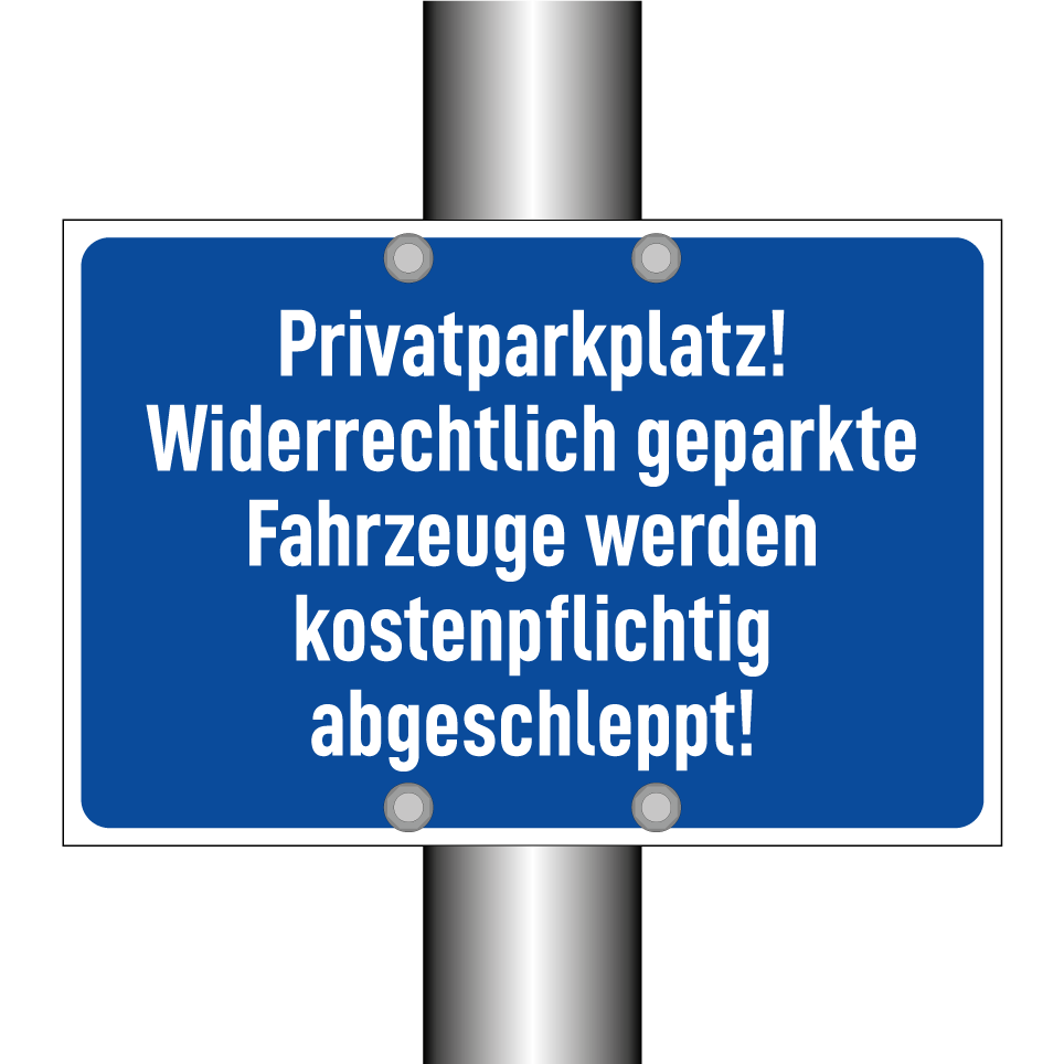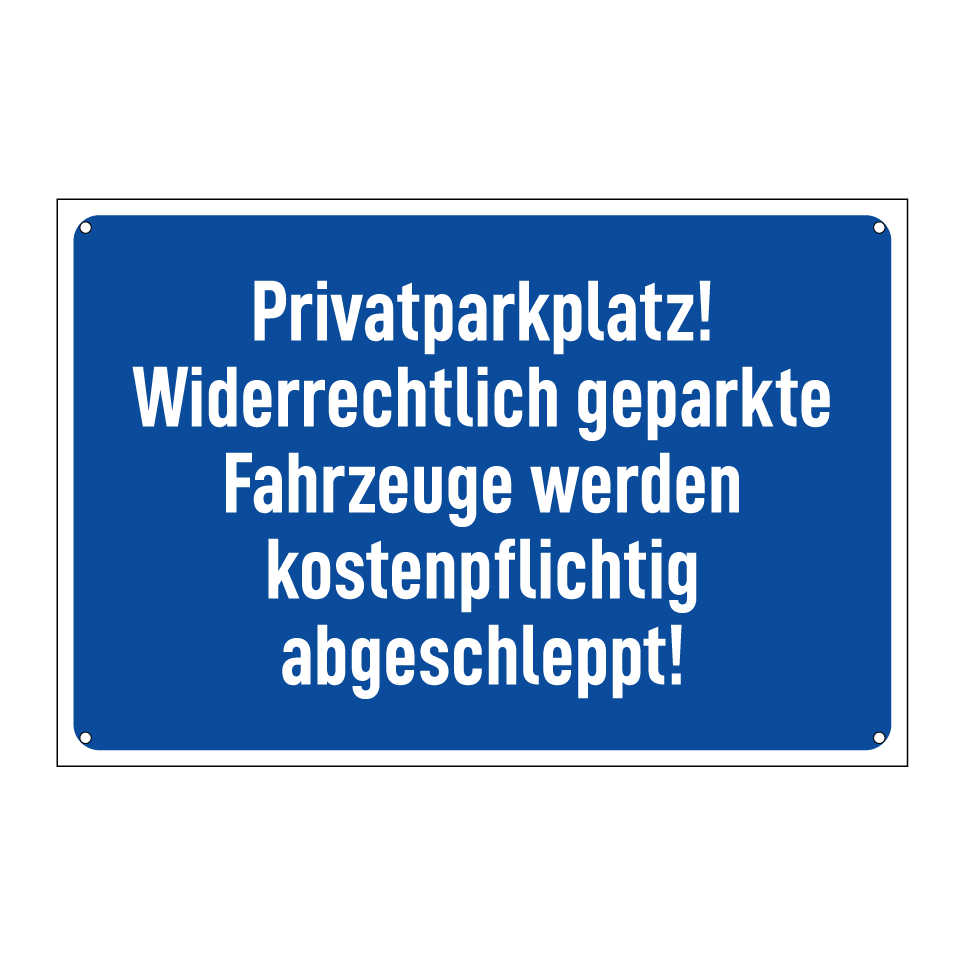 Parkschild mit dem Text Privatparkplatz! Widerrechtlich geparkte Fahrzeuge werden kostenpflichtig abgeschleppt!