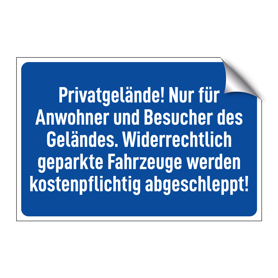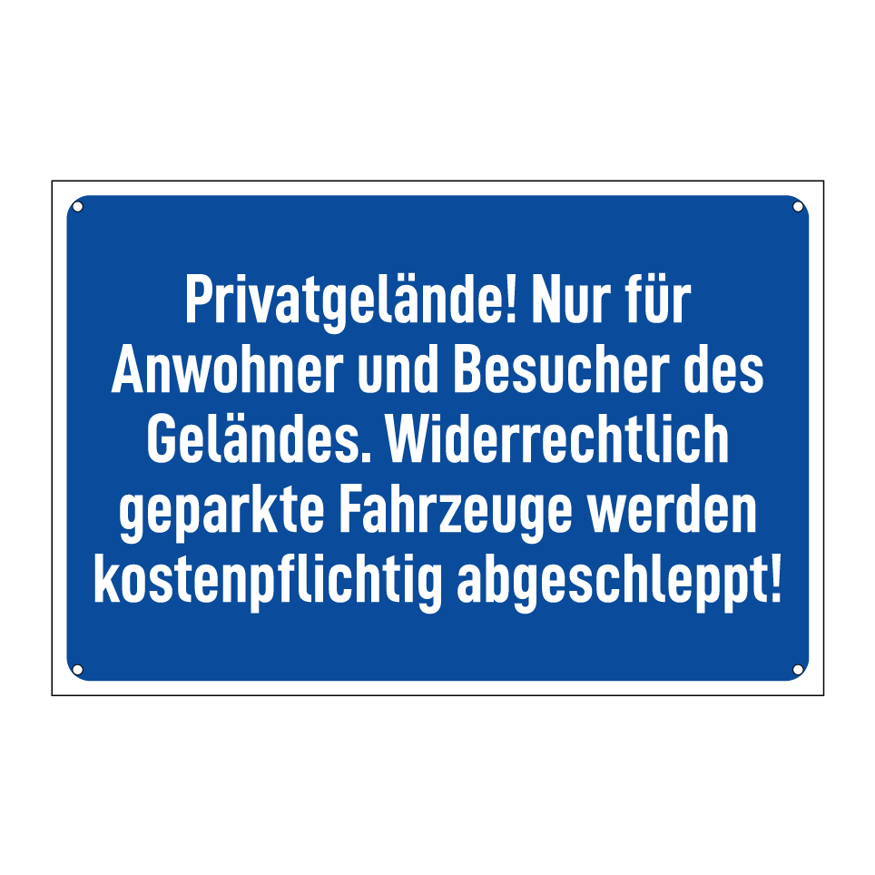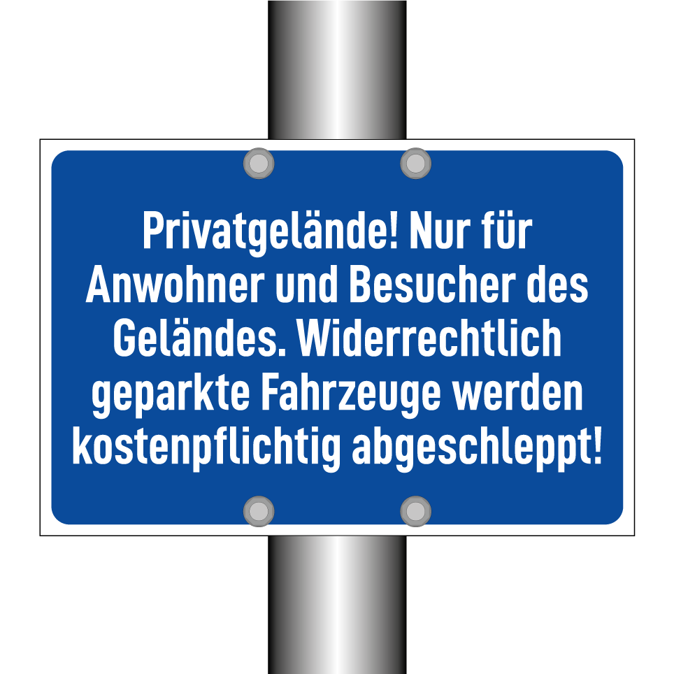 Parkschild mit dem Text Privatgelände! Nur für Anwohner und Besucher des Geländes. Widerrechtlich geparkte Fahrzeuge werden kostenpflichtig abgeschleppt!