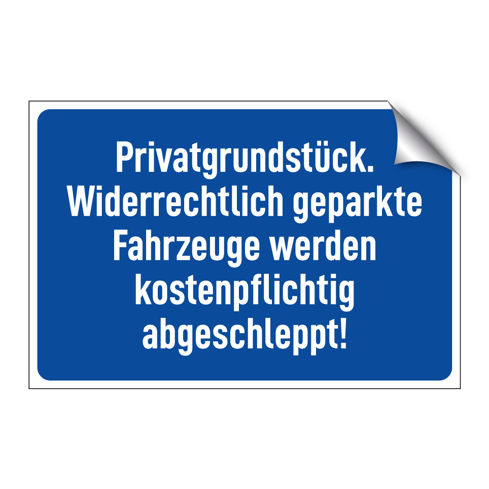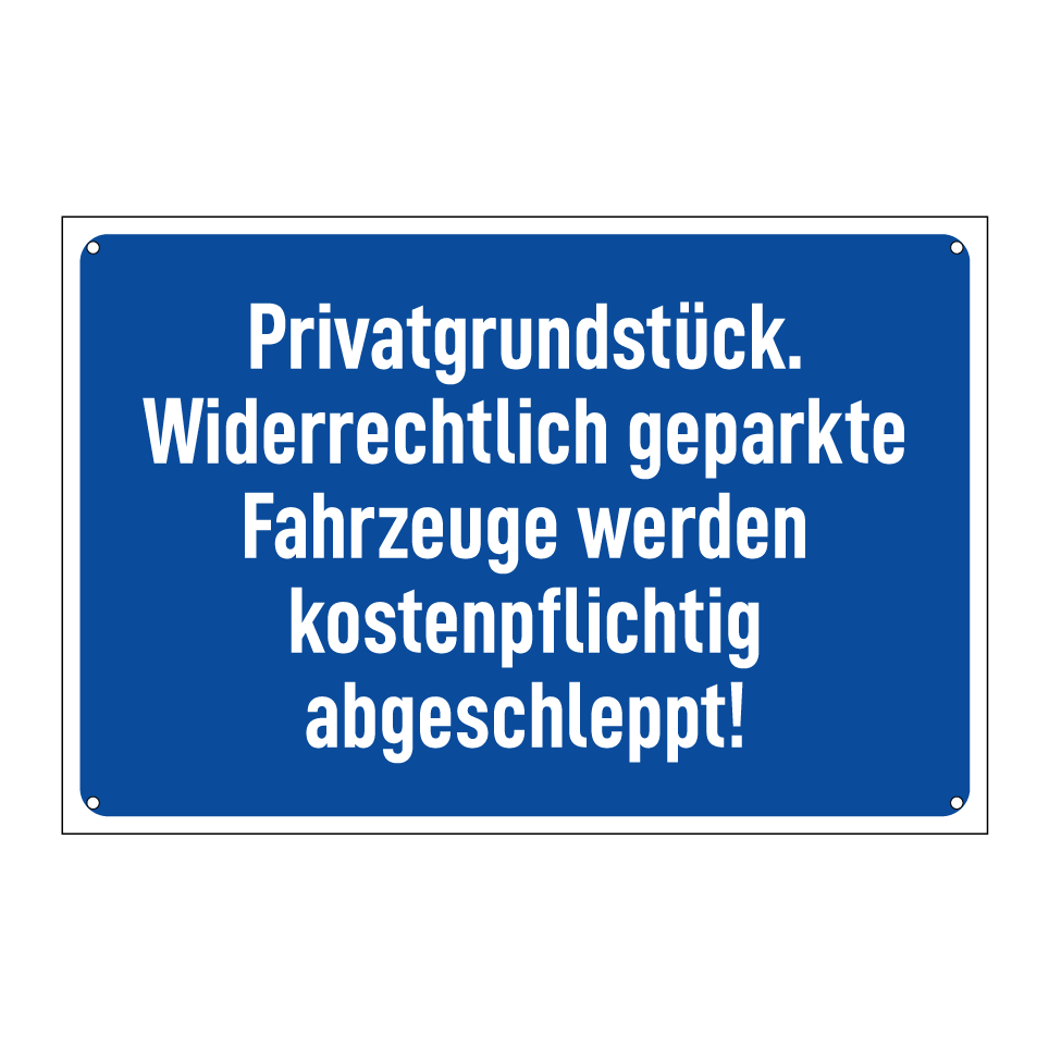 Parkschild mit dem Text Privatgrundstück. Widerrechtlich geparkte Fahrzeuge werden kostenpflichtig abgeschleppt!