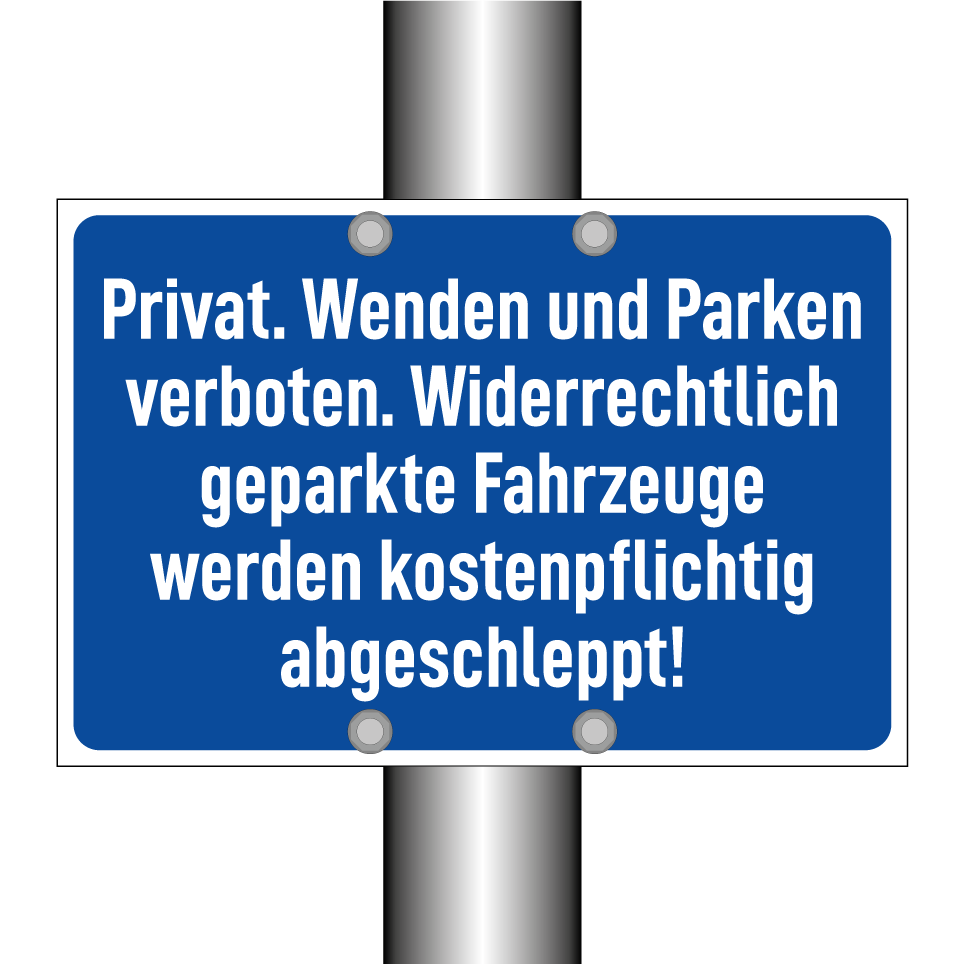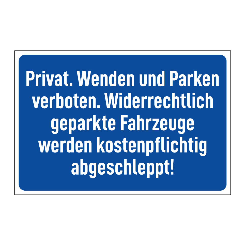 Parkschild mit dem Text Privat. Wenden und Parken verboten. Widerrechtlich geparkte Fahrzeuge werden kostenpflichtig abgeschleppt!