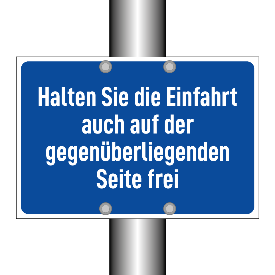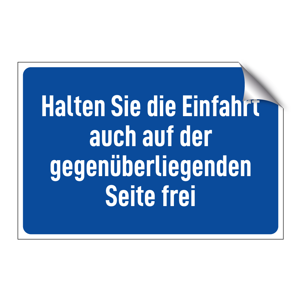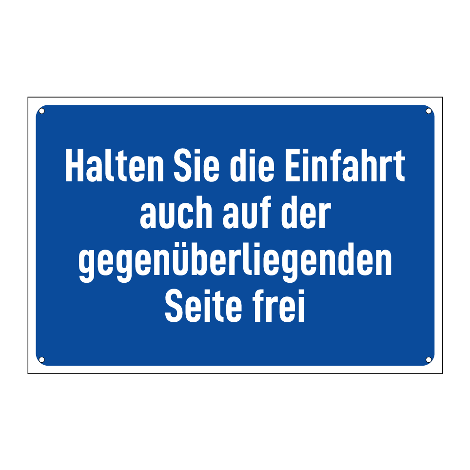 Parkverbotsschild mit dem Text Halten Sie die Einfahrt auch auf der gegenüberliegenden Seite frei