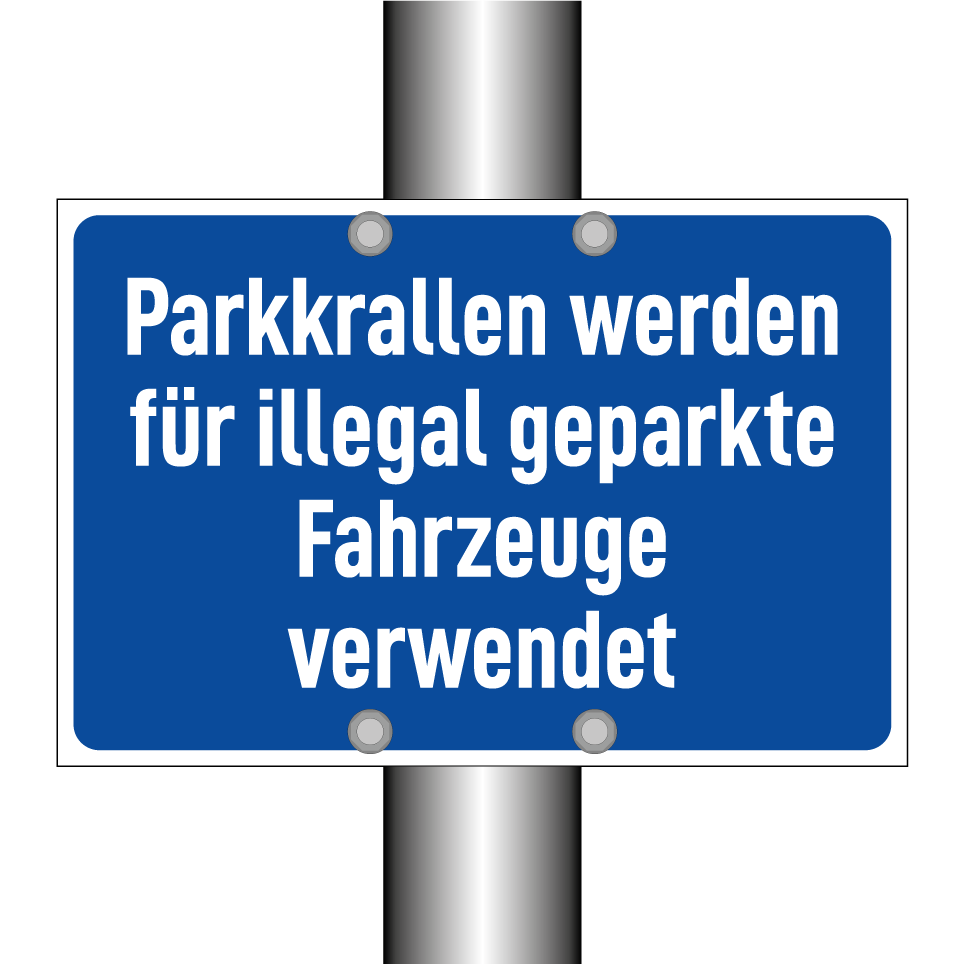 Parkverbotsschild mit dem Text Parkkrallen werden für illegal geparkte Fahrzeuge verwendet