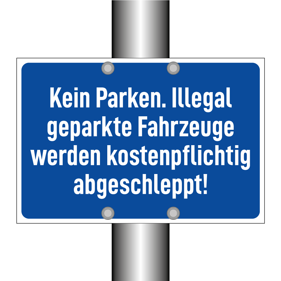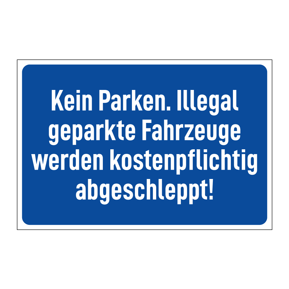 Parkverbotsschild mit dem Text Kein Parken. Illegal geparkte Fahrzeuge werden kostenpflichtig abgeschleppt!