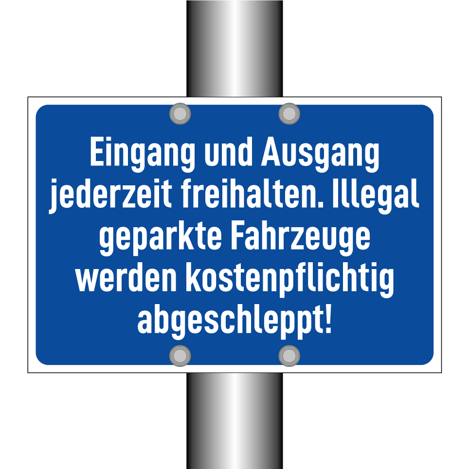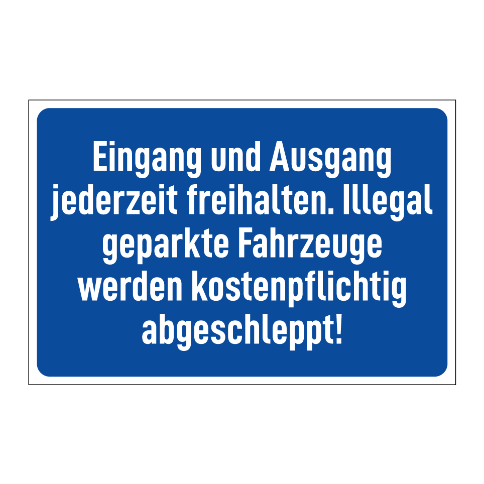 Parkverbotsschild mit dem Text Eingang und Ausgang jederzeit freihalten. Illegal geparkte Fahrzeuge werden kostenpflichtig abgeschleppt!