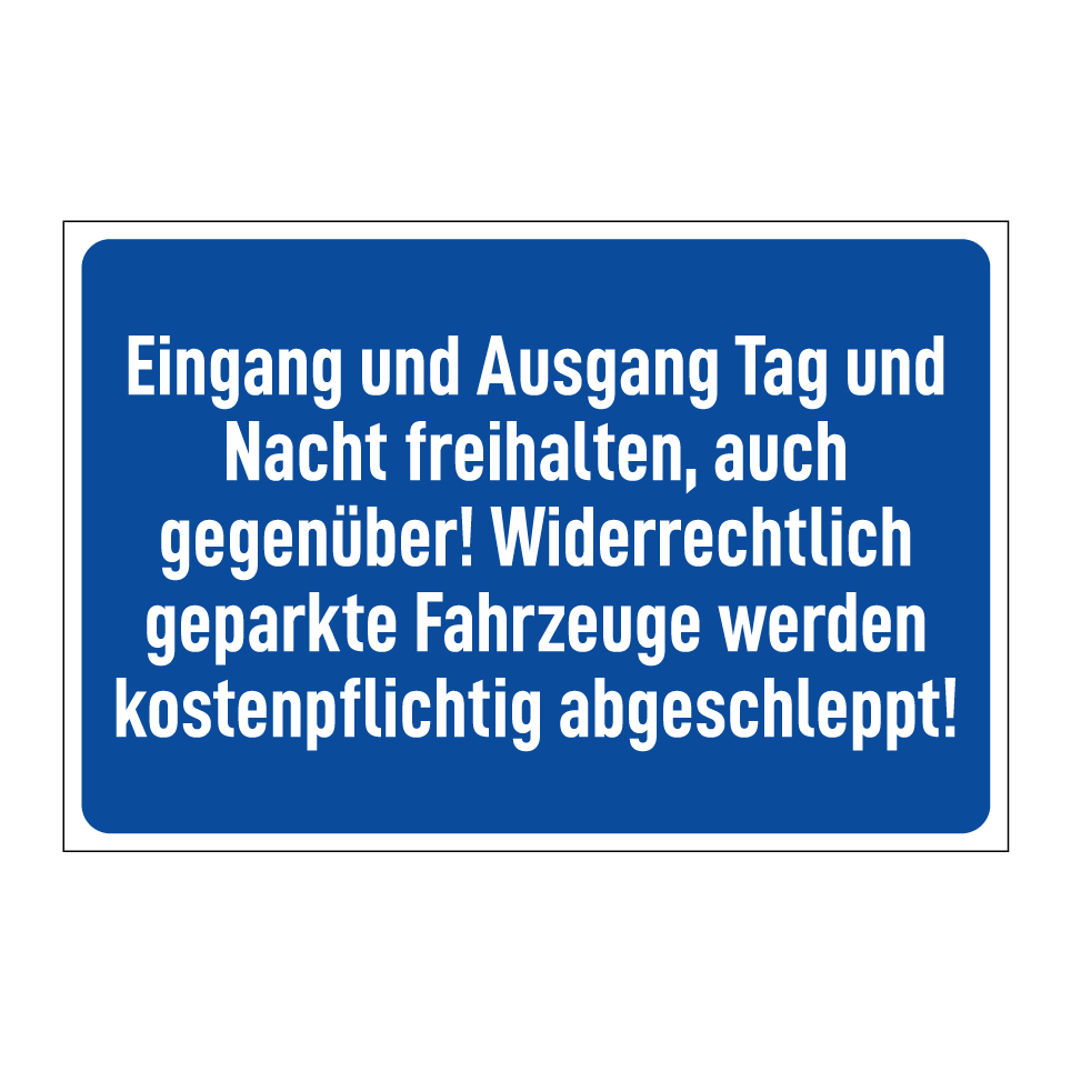 Parkverbotsschild mit dem Text Eingang und Ausgang Tag und Nacht freihalten, auch gegenüber! Widerrechtlich geparkte Fahrzeuge werden kostenpflichtig abgeschleppt!
