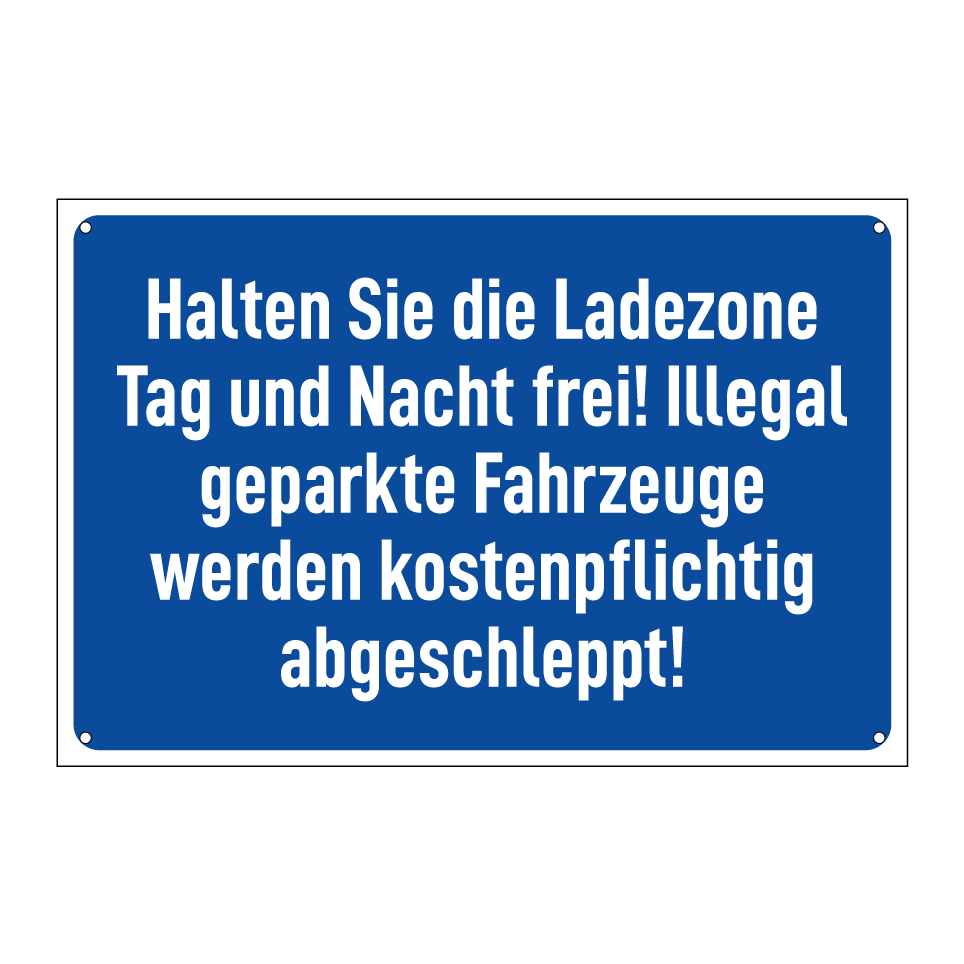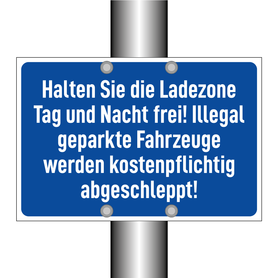 Parkverbotsschild mit dem Text Halten Sie die Ladezone Tag und Nacht frei! Illegal geparkte Fahrzeuge werden kostenpflichtig abgeschleppt!