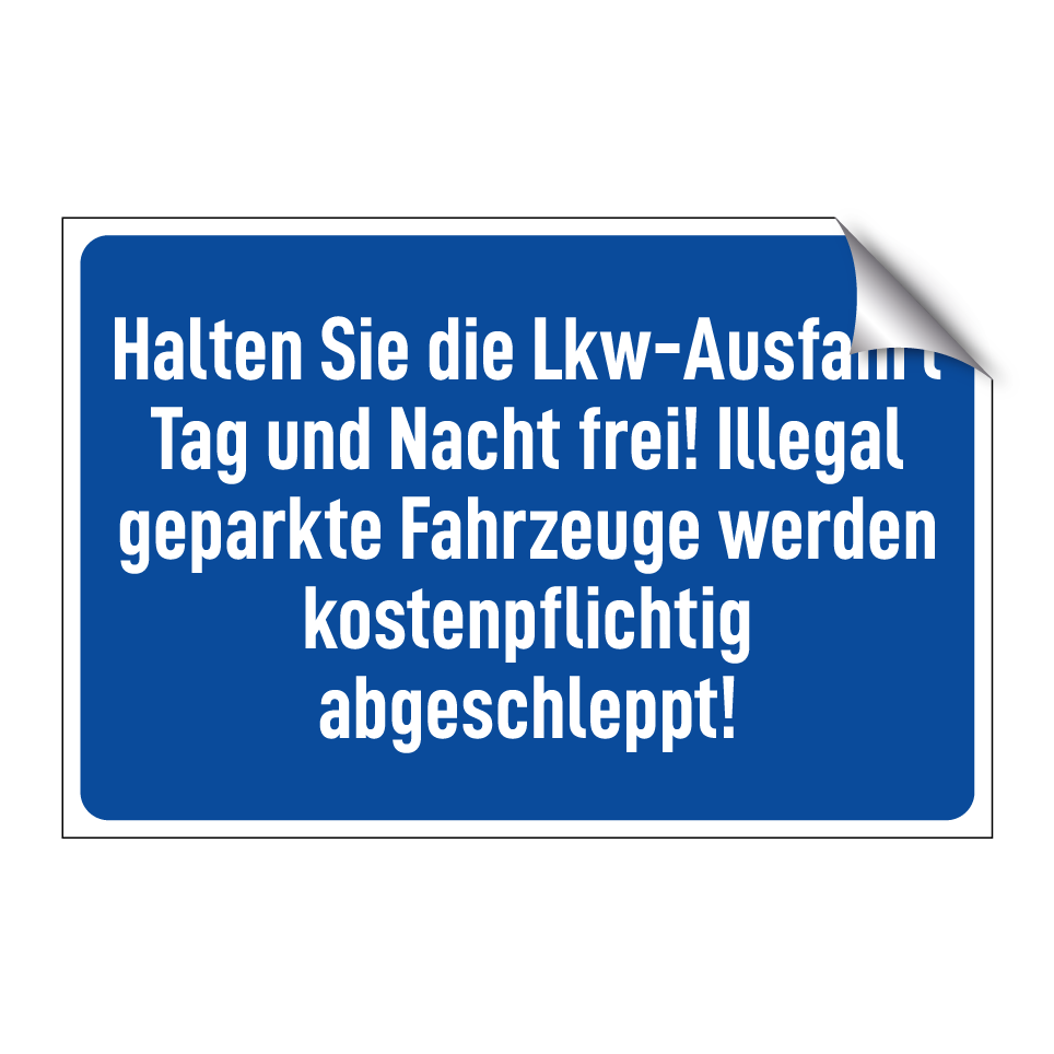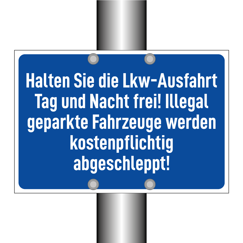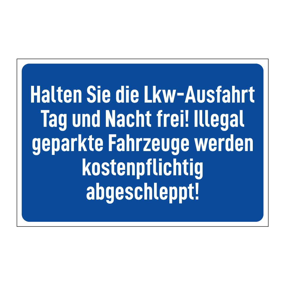 Parkverbotsschild mit dem Text Halten Sie die Lkw-Ausfahrt Tag und Nacht frei! Illegal geparkte Fahrzeuge werden kostenpflichtig abgeschleppt!