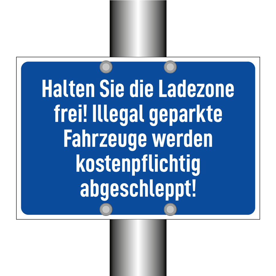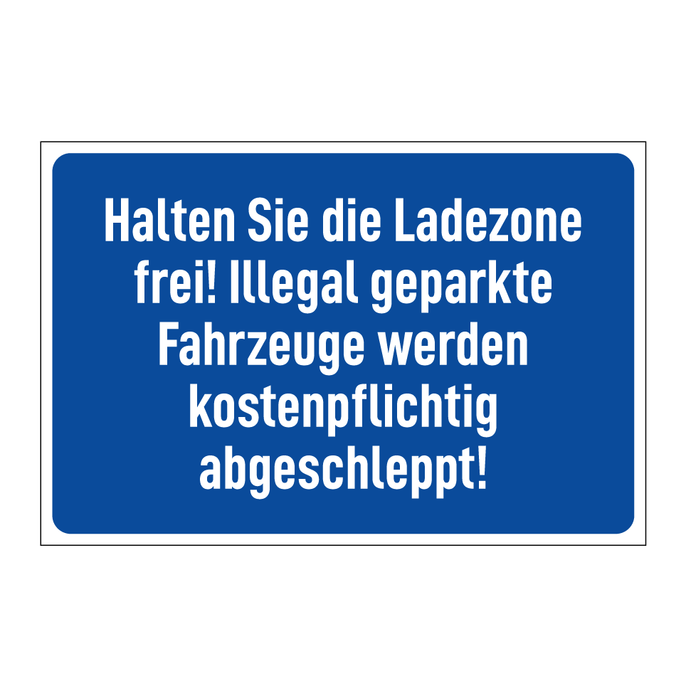 Parkverbotsschild mit dem Text Halten Sie die Ladezone frei! Illegal geparkte Fahrzeuge werden kostenpflichtig abgeschleppt!