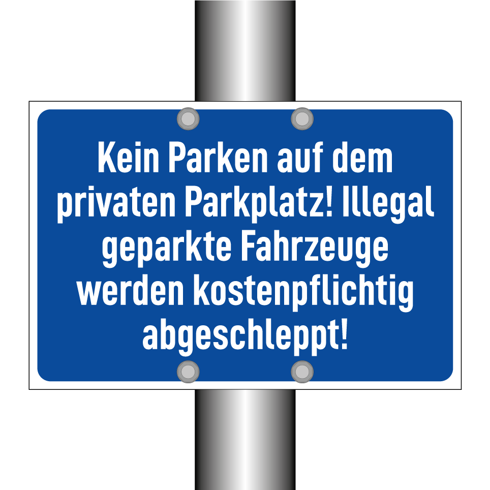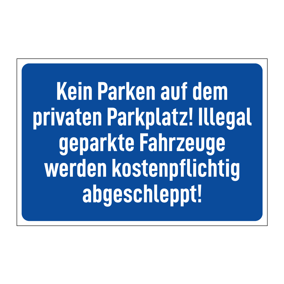 Parkverbotsschild mit dem Text Kein Parken auf dem privaten Parkplatz! Illegal geparkte Fahrzeuge werden kostenpflichtig abgeschleppt!