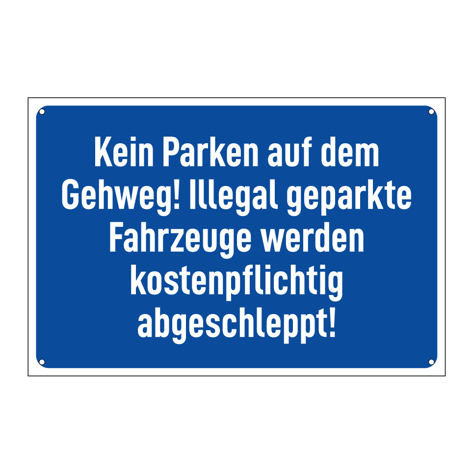 Parkverbotsschild mit dem Text Kein Parken auf dem Gehweg! Illegal geparkte Fahrzeuge werden kostenpflichtig abgeschleppt!