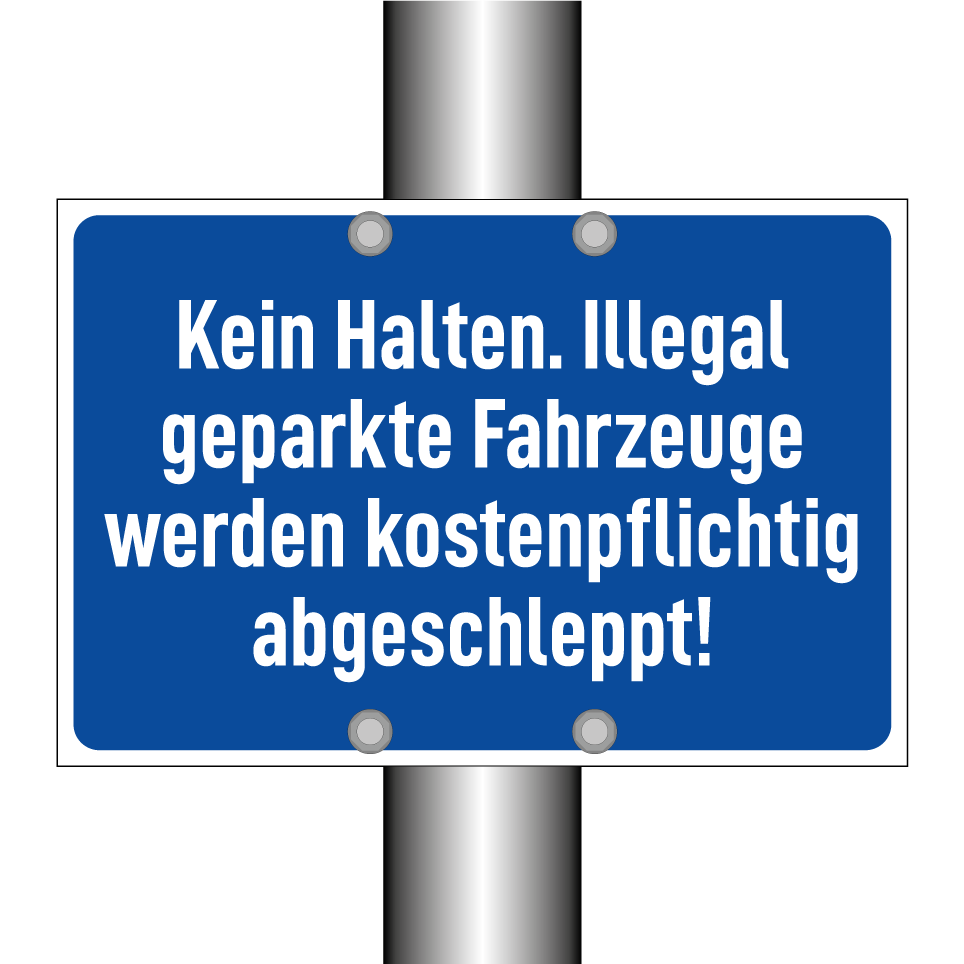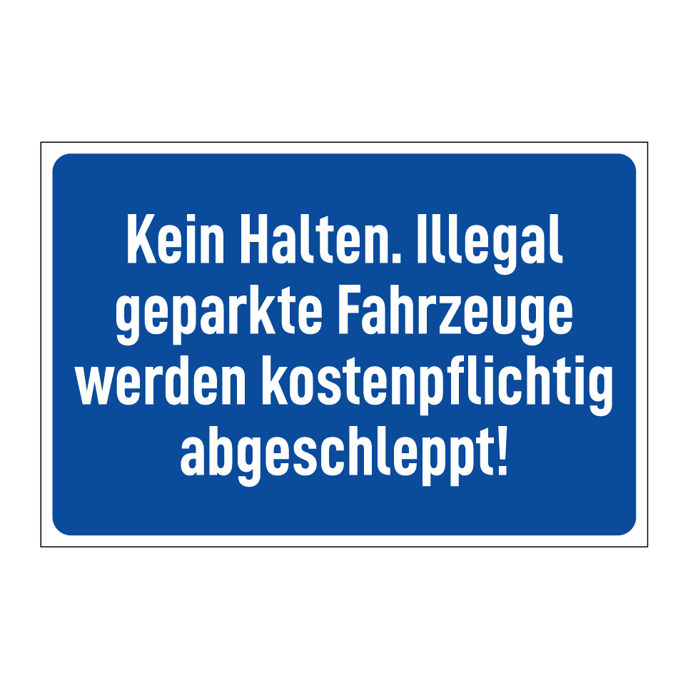 Parkverbotsschild mit dem Text Kein Halten. Illegal geparkte Fahrzeuge werden kostenpflichtig abgeschleppt!