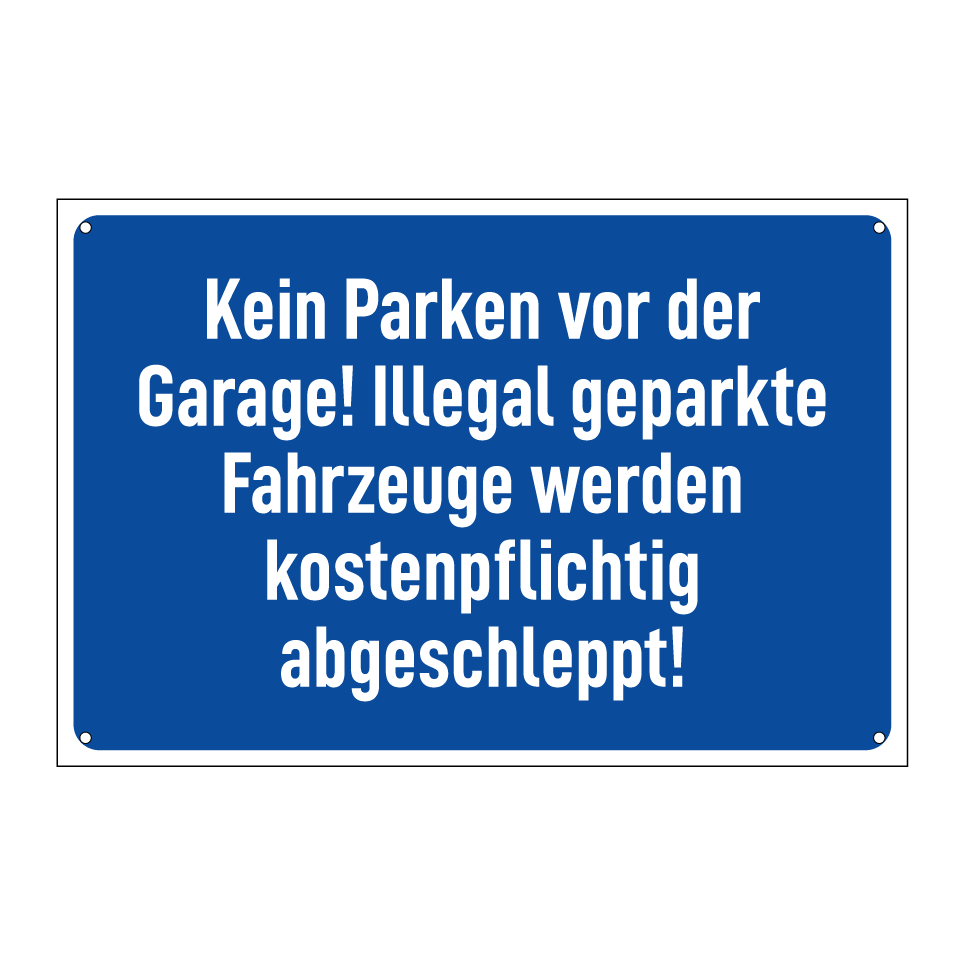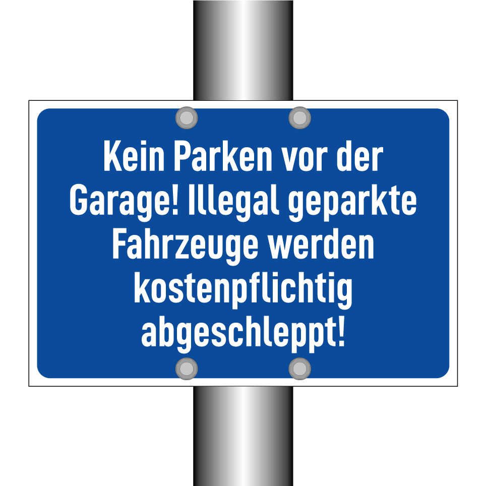 Parkverbotsschild mit dem Text Kein Parken vor der Garage! Illegal geparkte Fahrzeuge werden kostenpflichtig abgeschleppt!