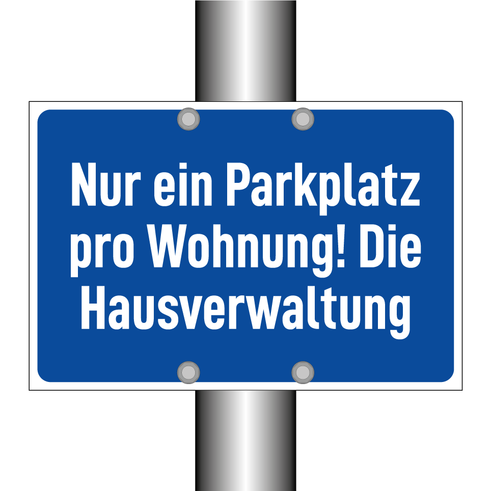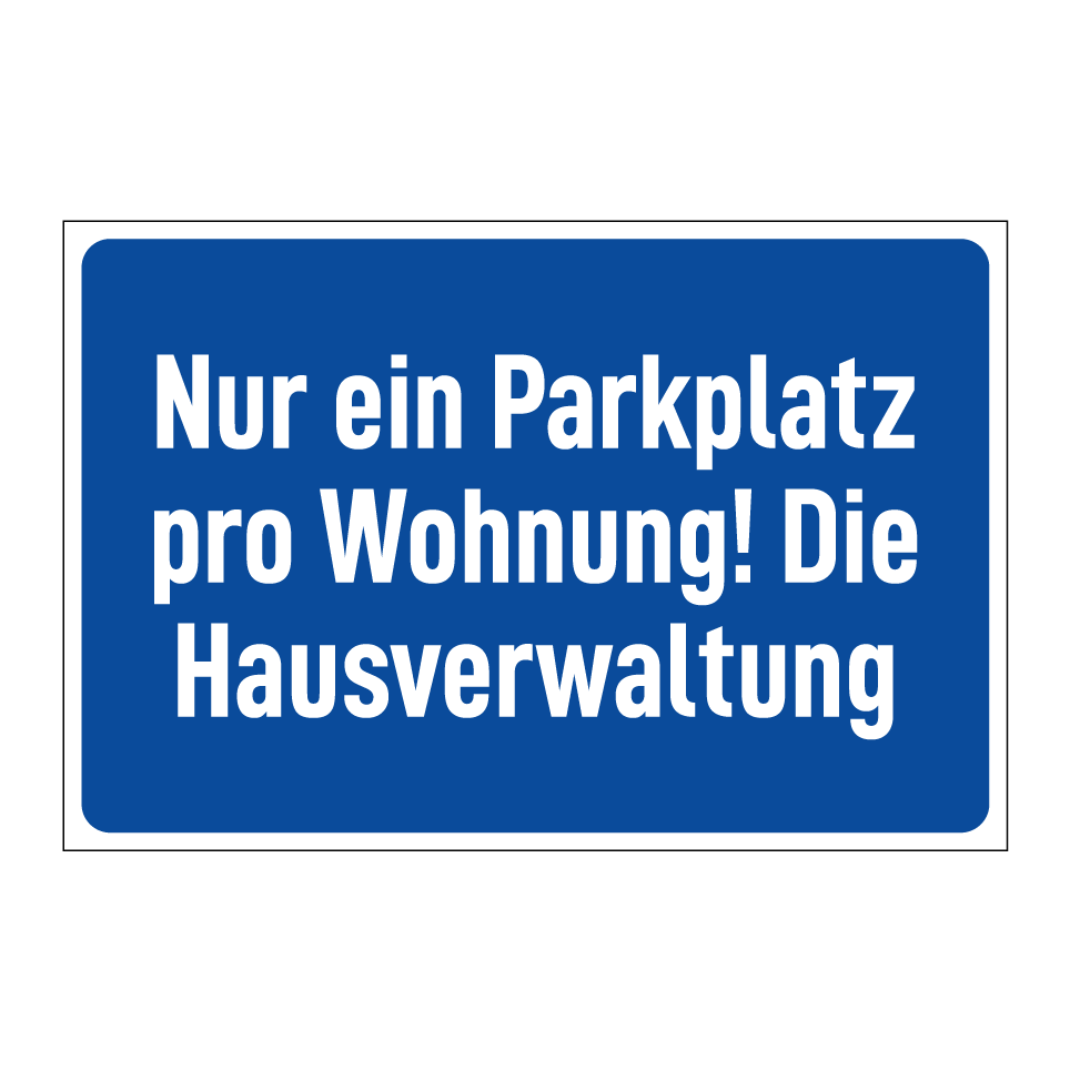 Parkschild mit dem Text Nur ein Parkplatz pro Wohnung! Die Hausverwaltung