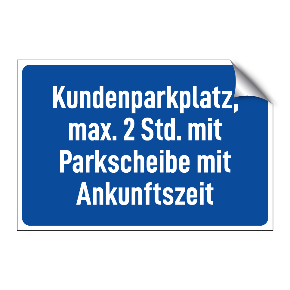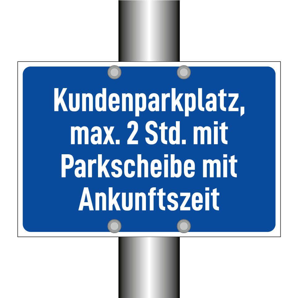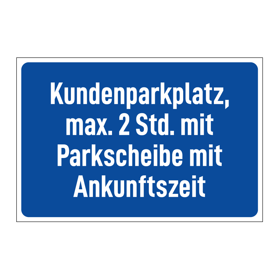 Parkschild mit dem Text Kundenparkplatz, max. 2 Std. mit Parkscheibe mit Ankunftszeit