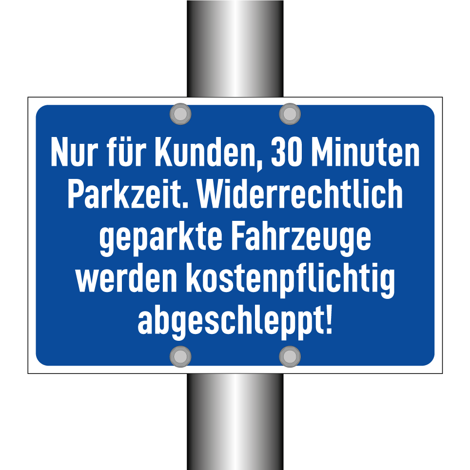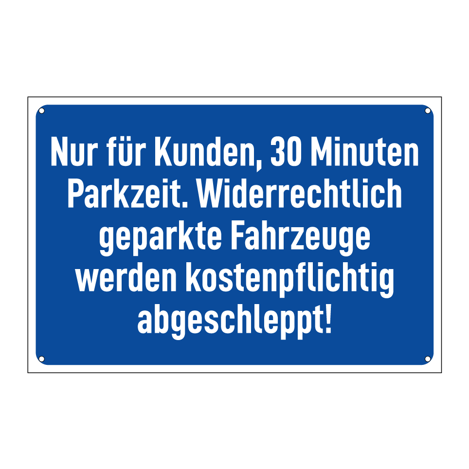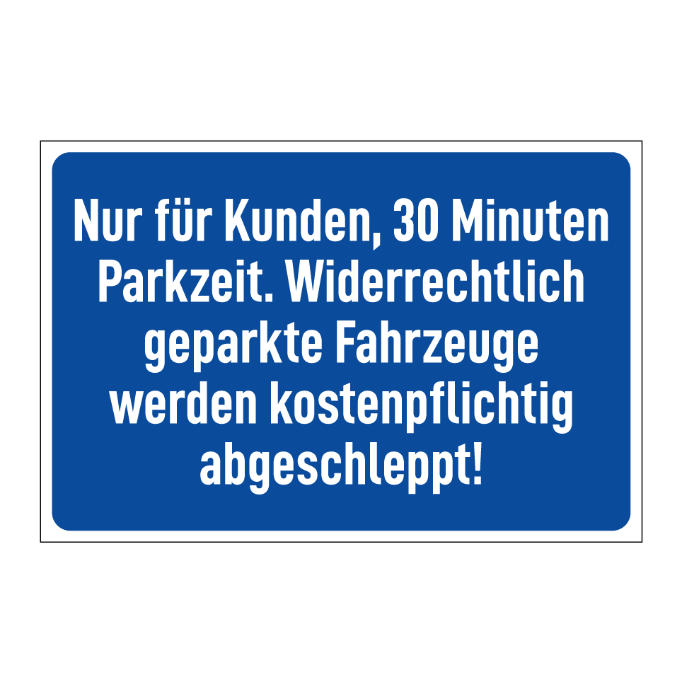 Parkschild mit dem Text Nur für Kunden, 30 Minuten Parkzeit. Widerrechtlich geparkte Fahrzeuge werden kostenpflichtig abgeschleppt!