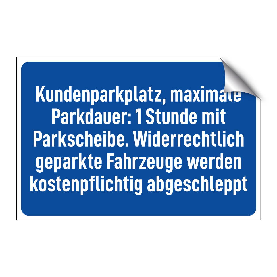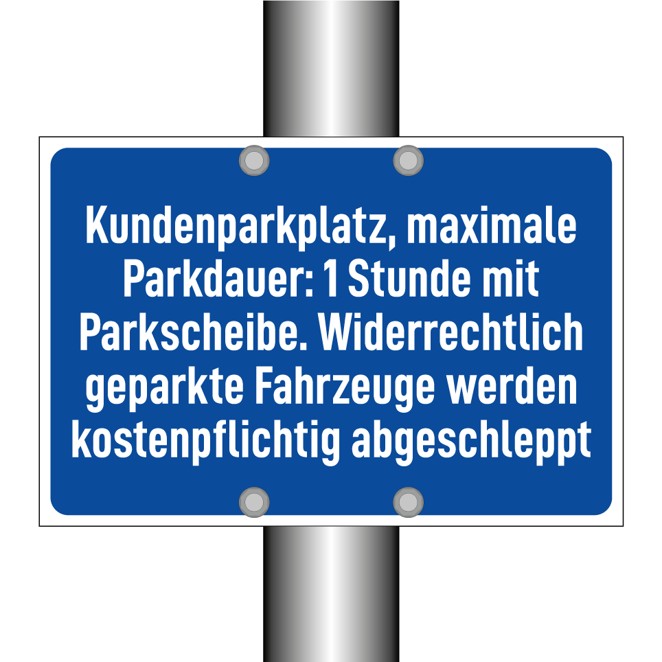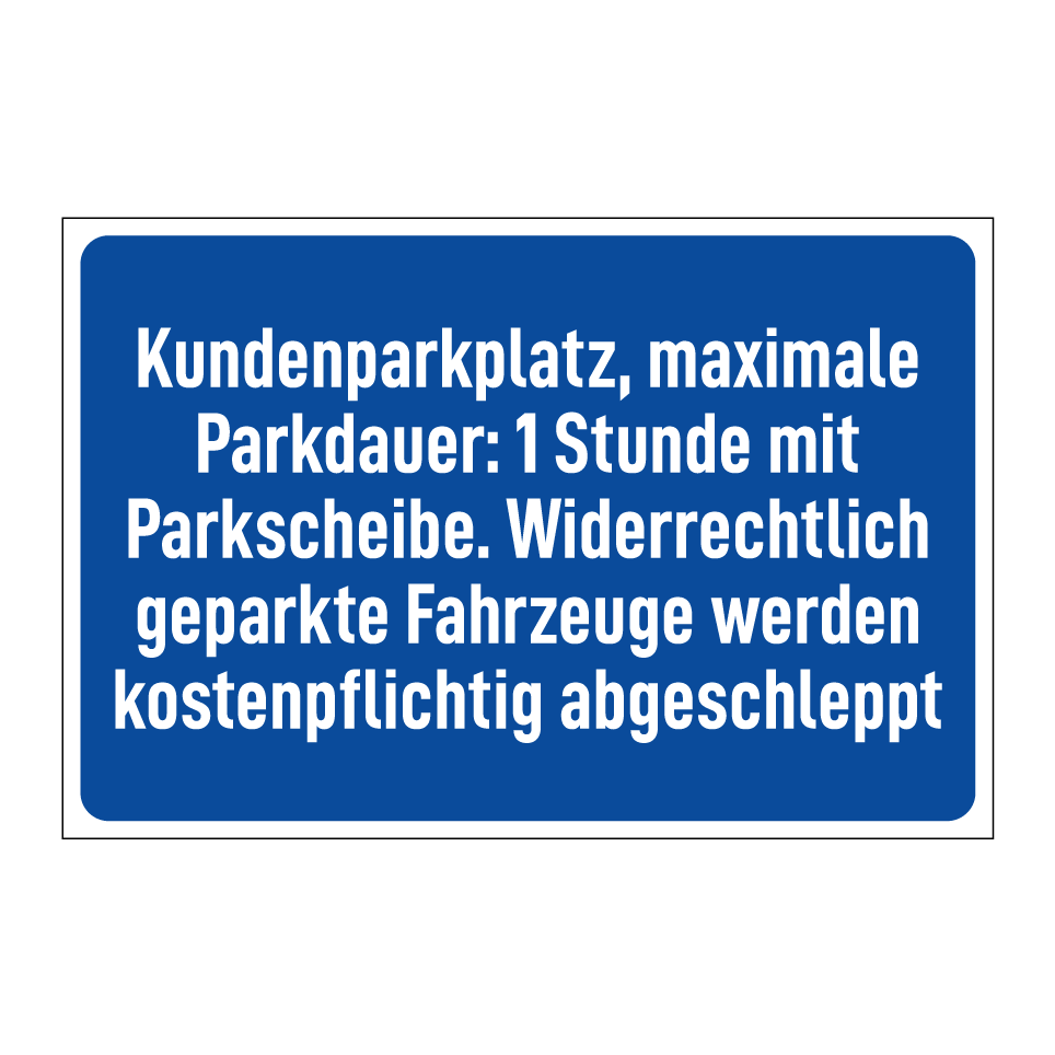 Parkschild mit dem Text Kundenparkplatz, maximale Parkdauer: 1 Stunde mit Parkscheibe. Widerrechtlich geparkte Fahrzeuge werden kostenpflichtig abgeschleppt