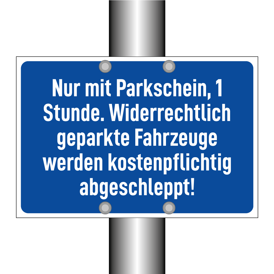 Parkschild mit dem Text Nur mit Parkschein, 1 Stunde. Widerrechtlich geparkte Fahrzeuge werden kostenpflichtig abgeschleppt!