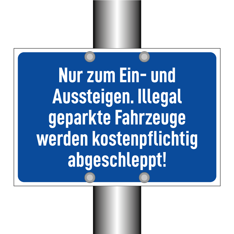 Parkschild mit dem Text Nur zum Ein- und Aussteigen. Illegal geparkte Fahrzeuge werden kostenpflichtig abgeschleppt!