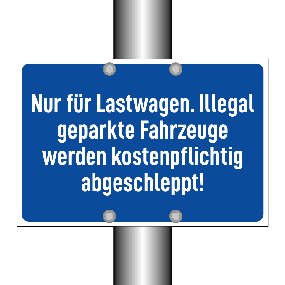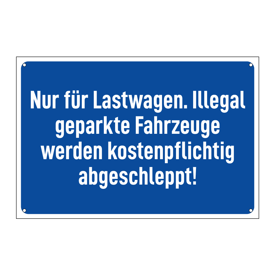 Diese Parkbeschilderung ist ideal für LKW-Parkplätze und sorgt dafür, dass nur berechtigte Fahrzeuge den Bereich nutzen. Sie dient dazu, unbefugtes Parken zu verhindern und die Sicherheit sowie den reibungslosen Ablauf auf Ihrem Gelände zu gewährleisten. Platzieren Sie sie an Einfahrten, Zufahrtsstraßen oder direkt auf dem Parkplatz, um klar zu kommunizieren, dass widerrechtlich abgestellte Fahrzeuge kostenpflichtig entfernt werden. Diese deutliche Kennzeichnung hilft, Missverständnisse zu vermeiden und die Ordnung zu wahren.