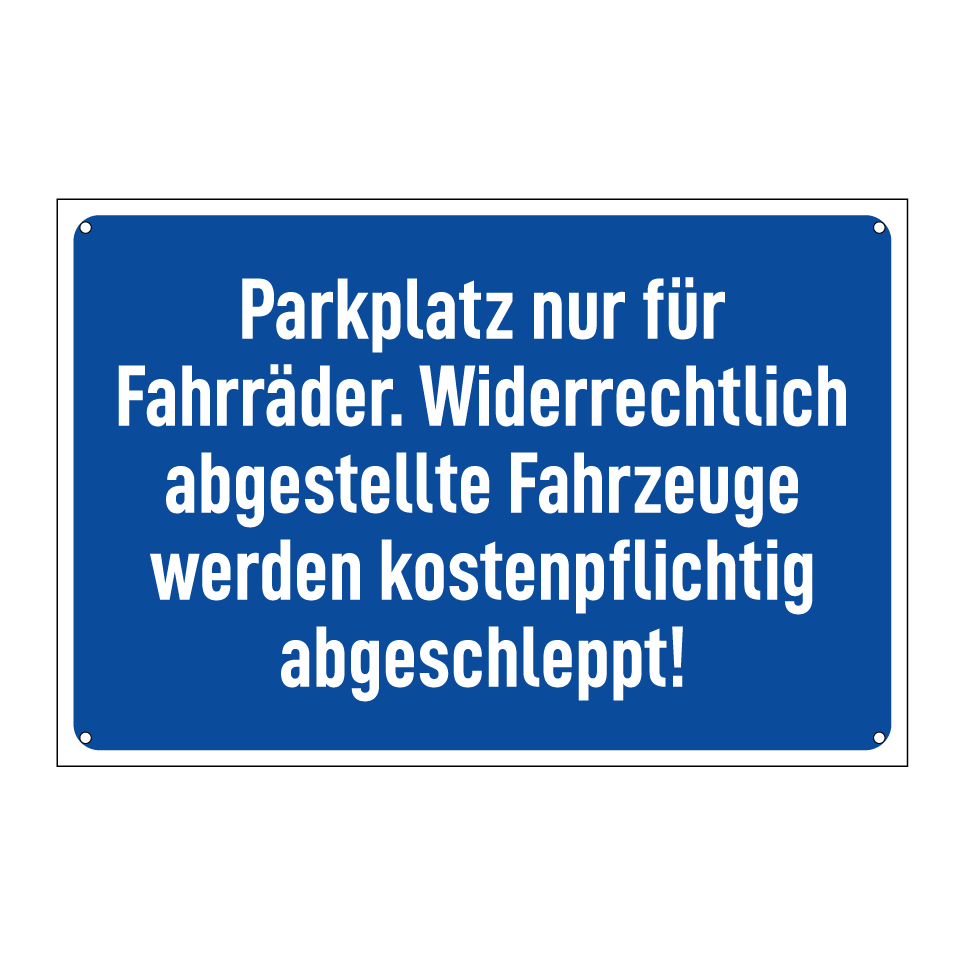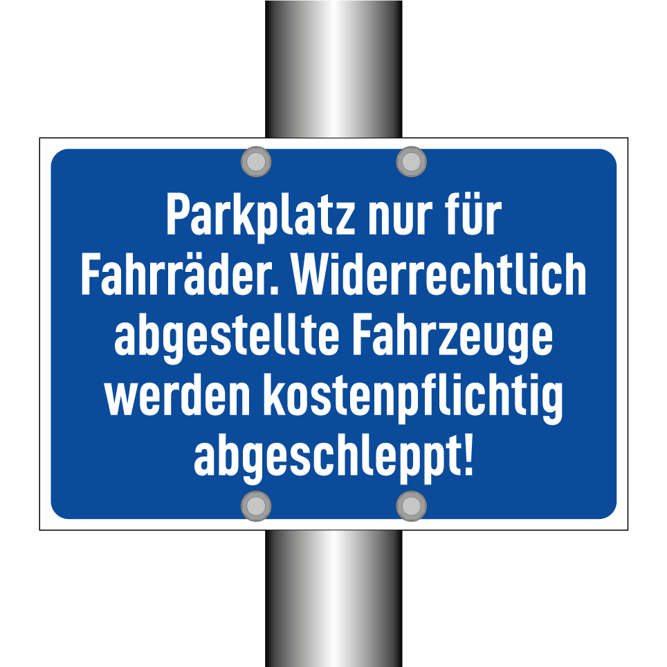 Parkschild mit dem Text Parkplatz nur für Fahrräder. Widerrechtlich abgestellte Fahrzeuge werden kostenpflichtig abgeschleppt!