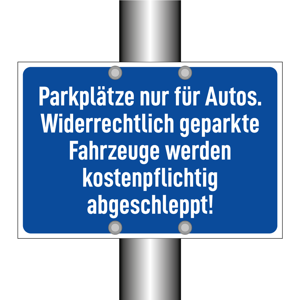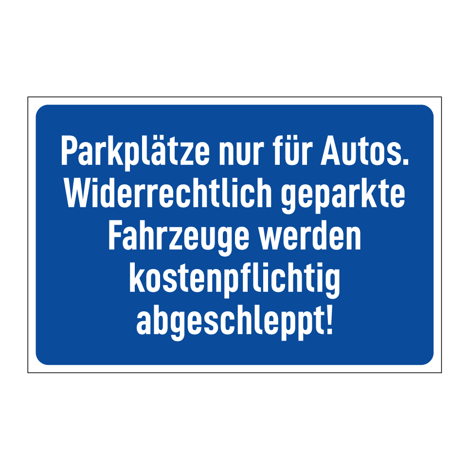 Parkschild mit dem Text Parkplätze nur für Autos. Widerrechtlich geparkte Fahrzeuge werden kostenpflichtig abgeschleppt!