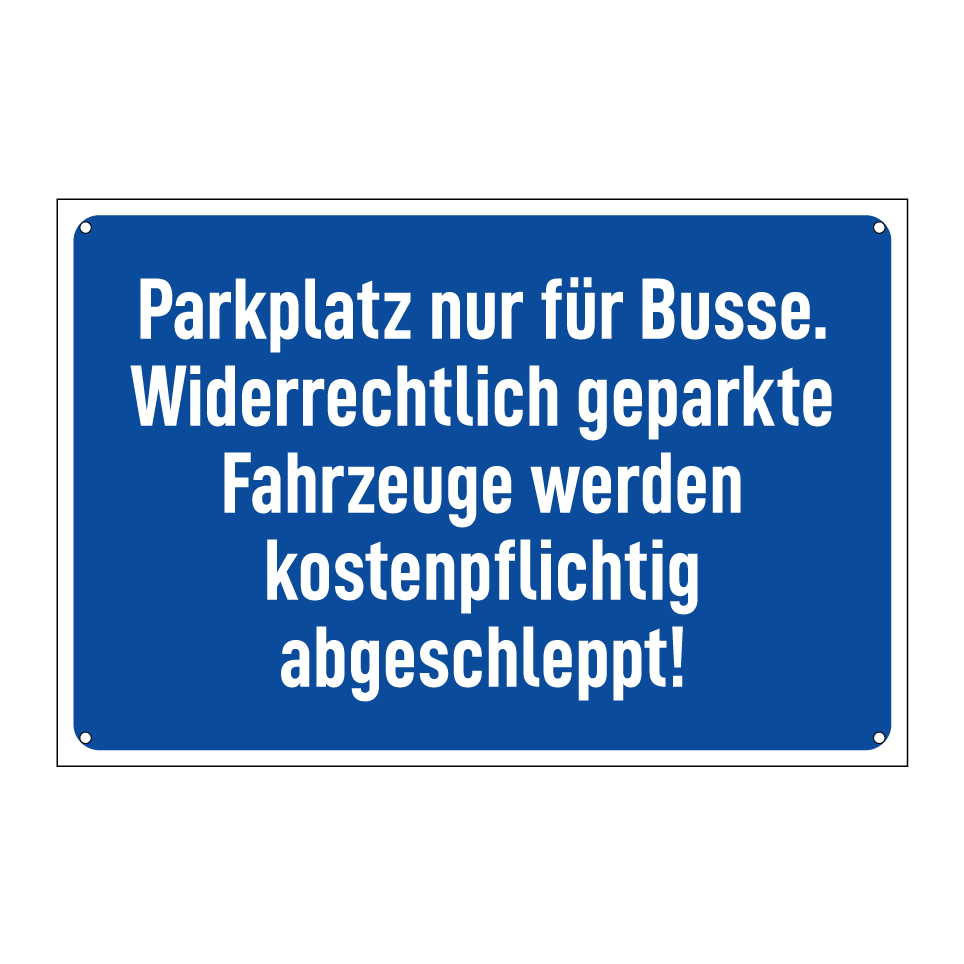 Diese Parkplatzausschilderung ist ideal für Bereiche, die ausschließlich für Busse reserviert sind. Sie dient dazu, unbefugtes Parken zu verhindern und sicherzustellen, dass nur berechtigte Fahrzeuge den Platz nutzen. Diese Beschilderung kann an Busbahnhöfen, Schulen oder Veranstaltungsorten angebracht werden, um die Einhaltung der Parkregeln zu gewährleisten. Bei Missachtung droht das kostenpflichtige Abschleppen des Fahrzeugs. Die klare Gestaltung mit blauer Hintergrundfarbe und weißem Text sorgt für hohe Sichtbarkeit und Verständlichkeit.