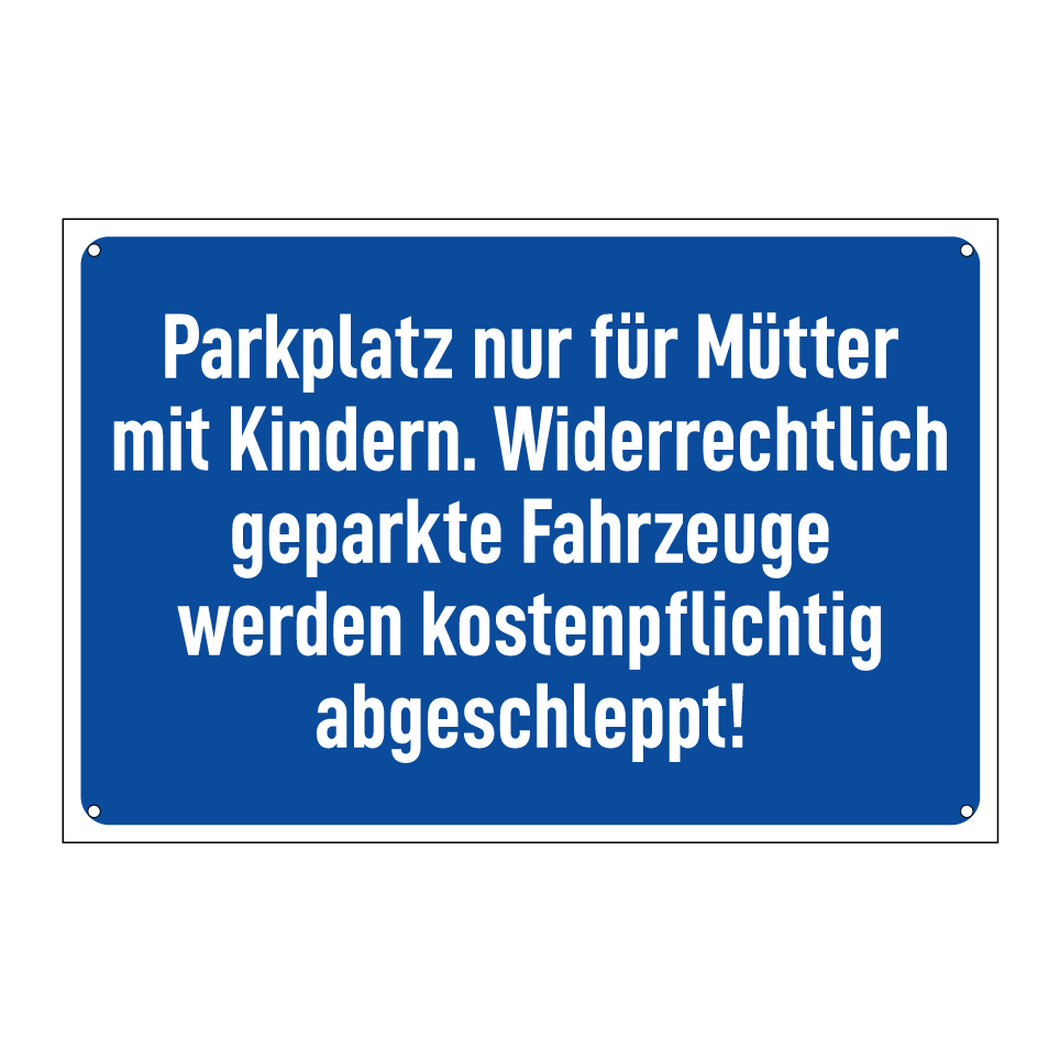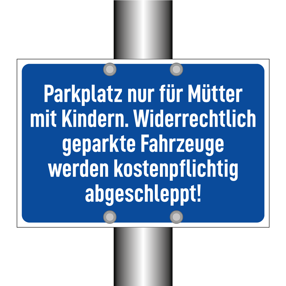 Parkschild mit dem Text Parkplatz nur für Mütter mit Kindern. Widerrechtlich geparkte Fahrzeuge werden kostenpflichtig abgeschleppt!