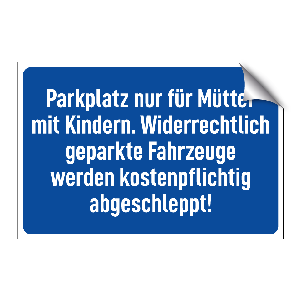 Parkplatz nur für Mütter mit Kindern. Widerrechtlich geparkte Fahrzeuge werden kostenpflichtig abgeschleppt!