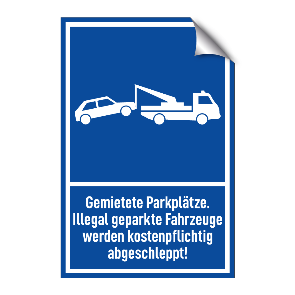Parkschild mit dem Text Gemietete Parkplätze. Illegal geparkte Fahrzeuge werden kostenpflichtig abgeschleppt!