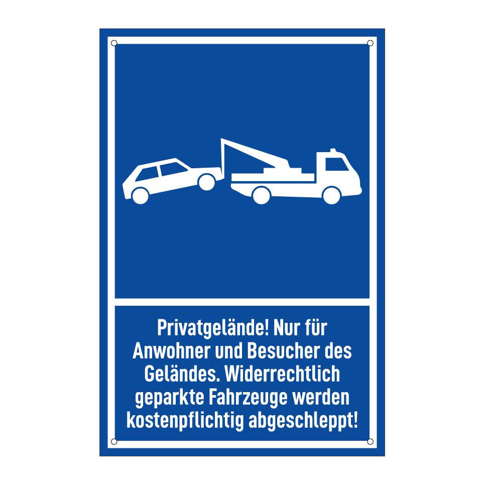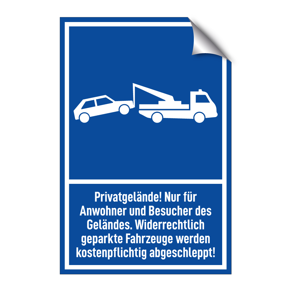 Parkschild mit dem Text Privatgelände! Nur für Anwohner und Besucher des Geländes. Widerrechtlich geparkte Fahrzeuge werden kostenpflichtig abgeschleppt!