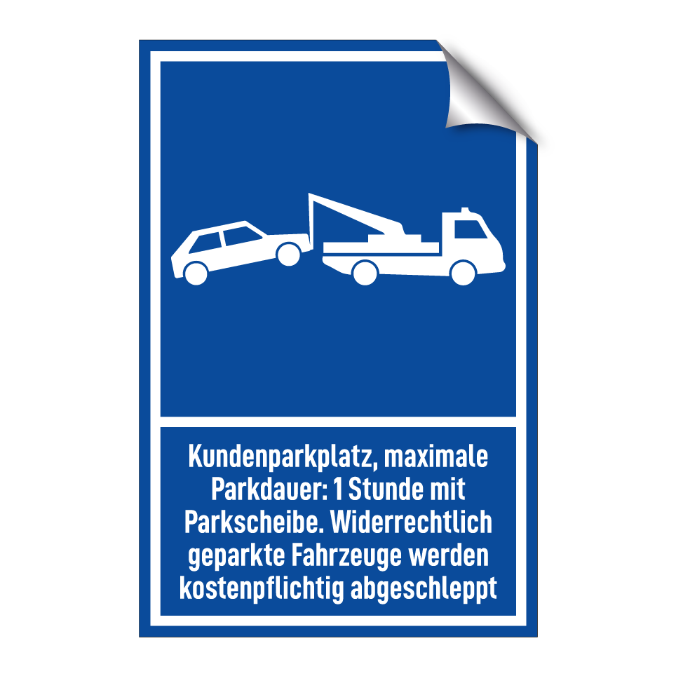 Parkschild mit dem Text Kundenparkplatz, maximale Parkdauer: 1 Stunde mit Parkscheibe. Widerrechtlich geparkte Fahrzeuge werden kostenpflichtig abgeschleppt