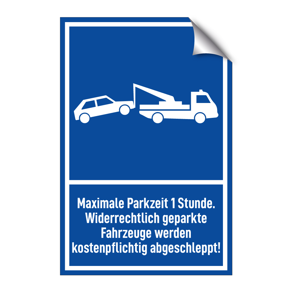 Parkschild mit dem Text Maximale Parkzeit 1 Stunde. Widerrechtlich geparkte Fahrzeuge werden kostenpflichtig abgeschleppt!