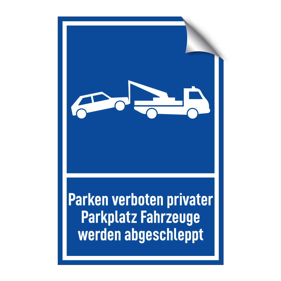 Parkschild mit dem Text Parken verboten privater Parkplatz Fahrzeuge werden abgeschleppt