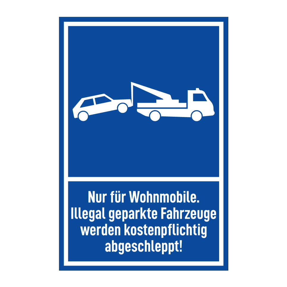 Parkschild mit dem Text Nur für Wohnmobile. Illegal geparkte Fahrzeuge werden kostenpflichtig abgeschleppt!