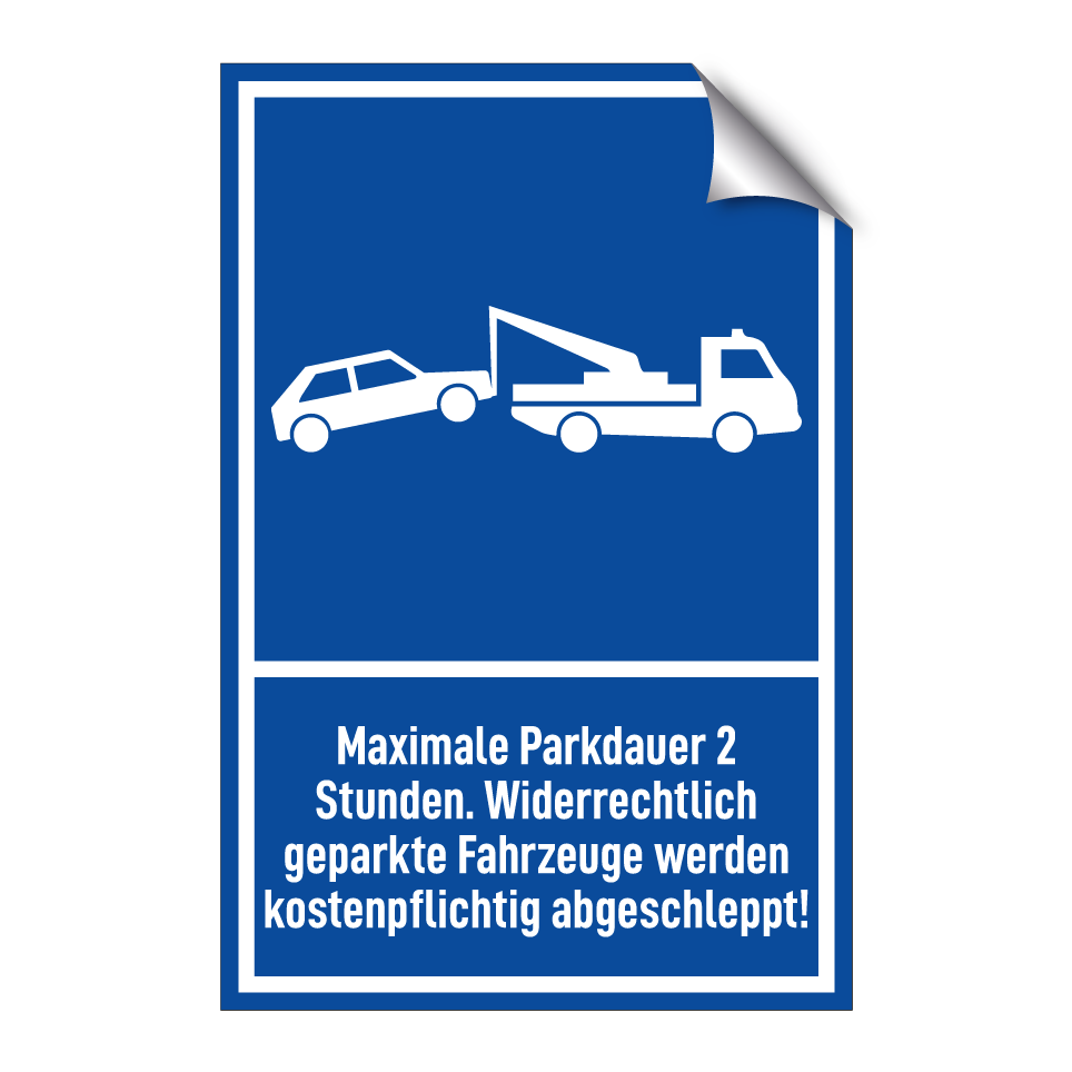 Parkschild mit dem Text Maximale Parkdauer 2 Stunden. Widerrechtlich geparkte Fahrzeuge werden kostenpflichtig abgeschleppt!