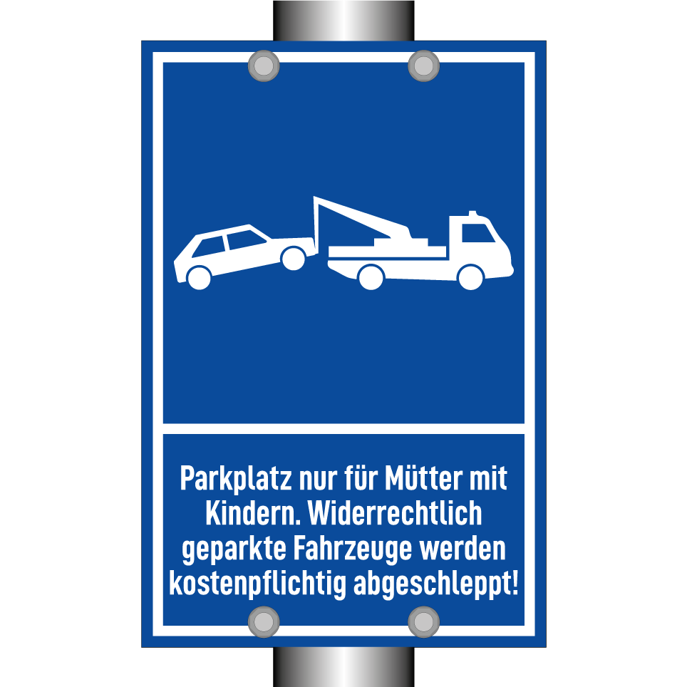 Parkschild mit dem Text Parkplatz nur für Mütter mit Kindern. Widerrechtlich geparkte Fahrzeuge werden kostenpflichtig abgeschleppt!