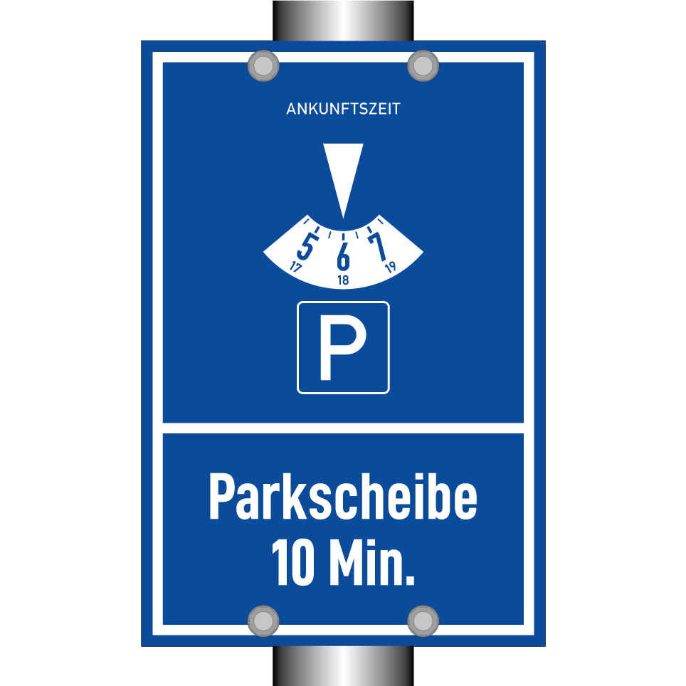 Parkschild mit dem Text Parkscheibe 10 Min.