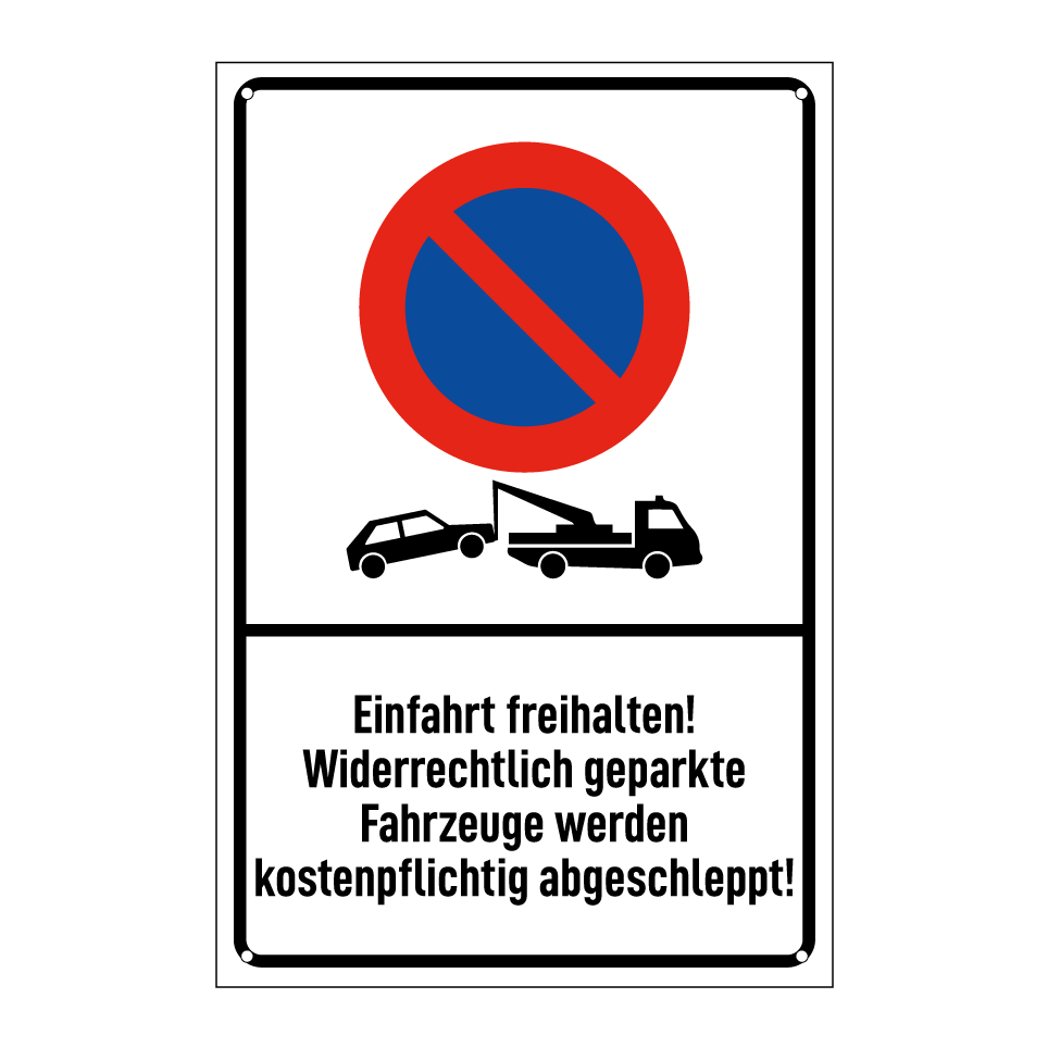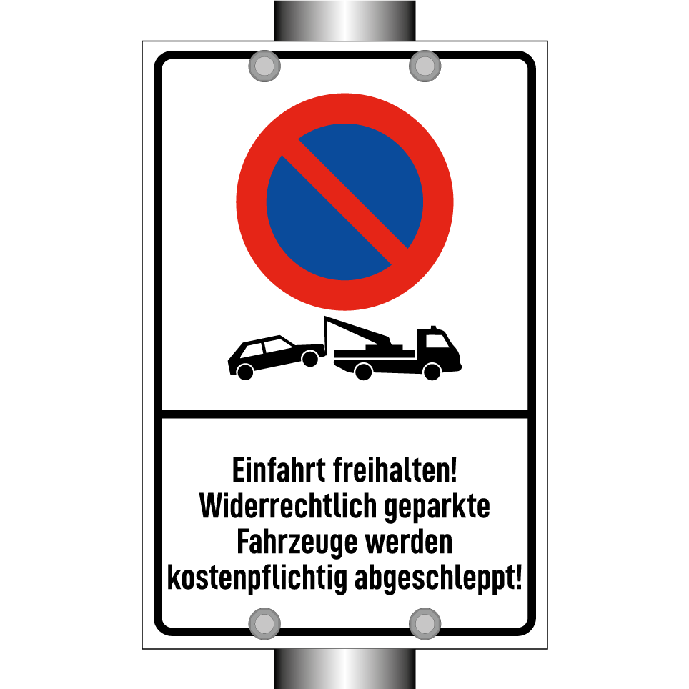 Parkverbotsschild mit dem Text Einfahrt freihalten! Widerrechtlich geparkte Fahrzeuge werden kostenpflichtig abgeschleppt!