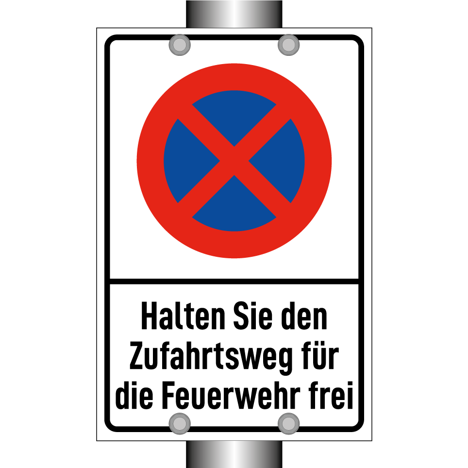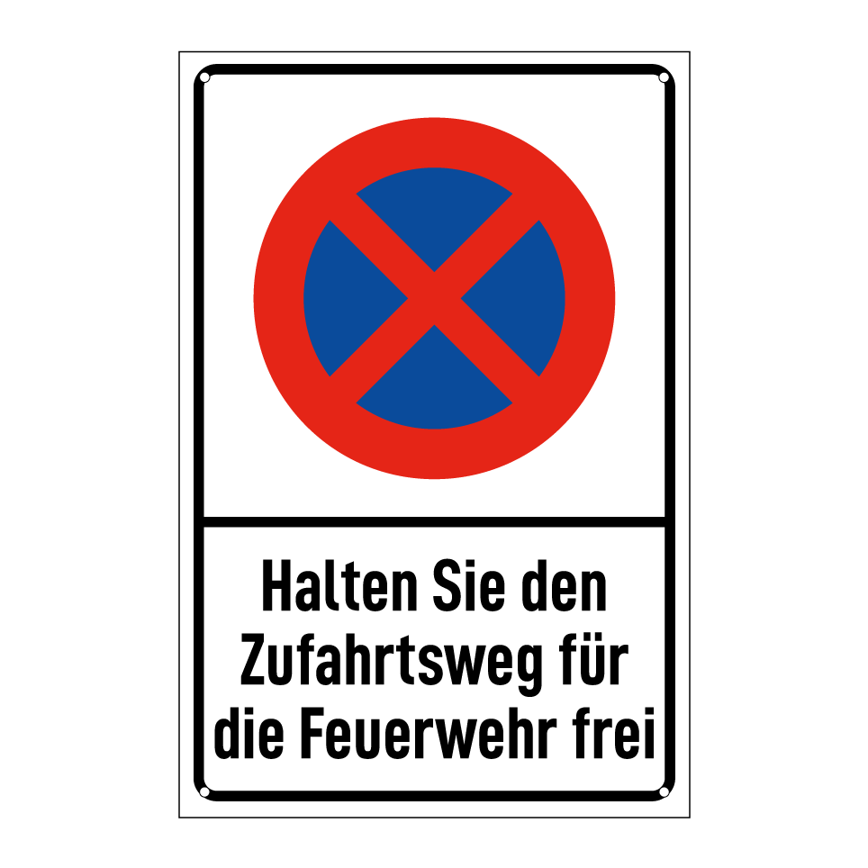 Parkverbotsschild mit dem Text Halten Sie den Zufahrtsweg für die Feuerwehr frei