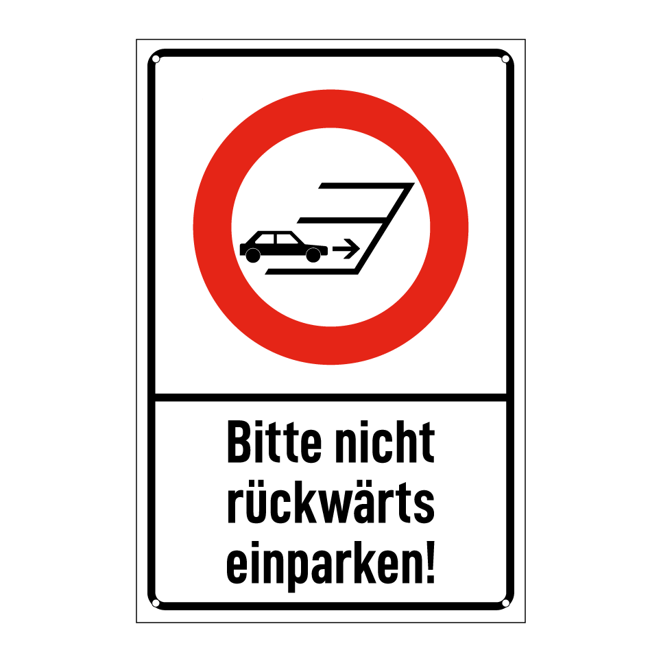 Diese Verbotstafel eignet sich ideal für Parkplätze, Einfahrten und Garagen, um das Rückwärtseinparken zu verhindern. Sie dient dazu, Unfälle und Schäden zu vermeiden, indem sie klar signalisiert, dass das Rückwärtsparken unerwünscht ist. Die Tafel kann an Wänden, Zäunen oder Pfosten angebracht werden und ist besonders nützlich in Bereichen mit begrenztem Platzangebot. Ihre klare Gestaltung mit schwarzem Text und Symbol auf weißem Hintergrund sorgt für hohe Sichtbarkeit und Verständlichkeit.