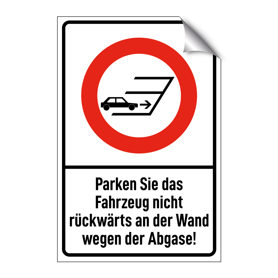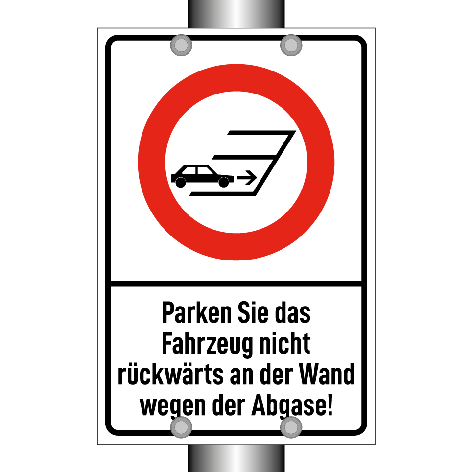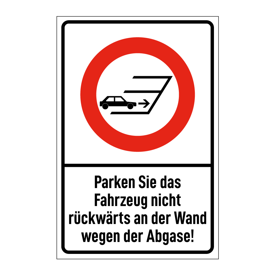 Parkverbotsschild mit dem Text Parken Sie das Fahrzeug nicht rückwärts an der Wand wegen der Abgase!