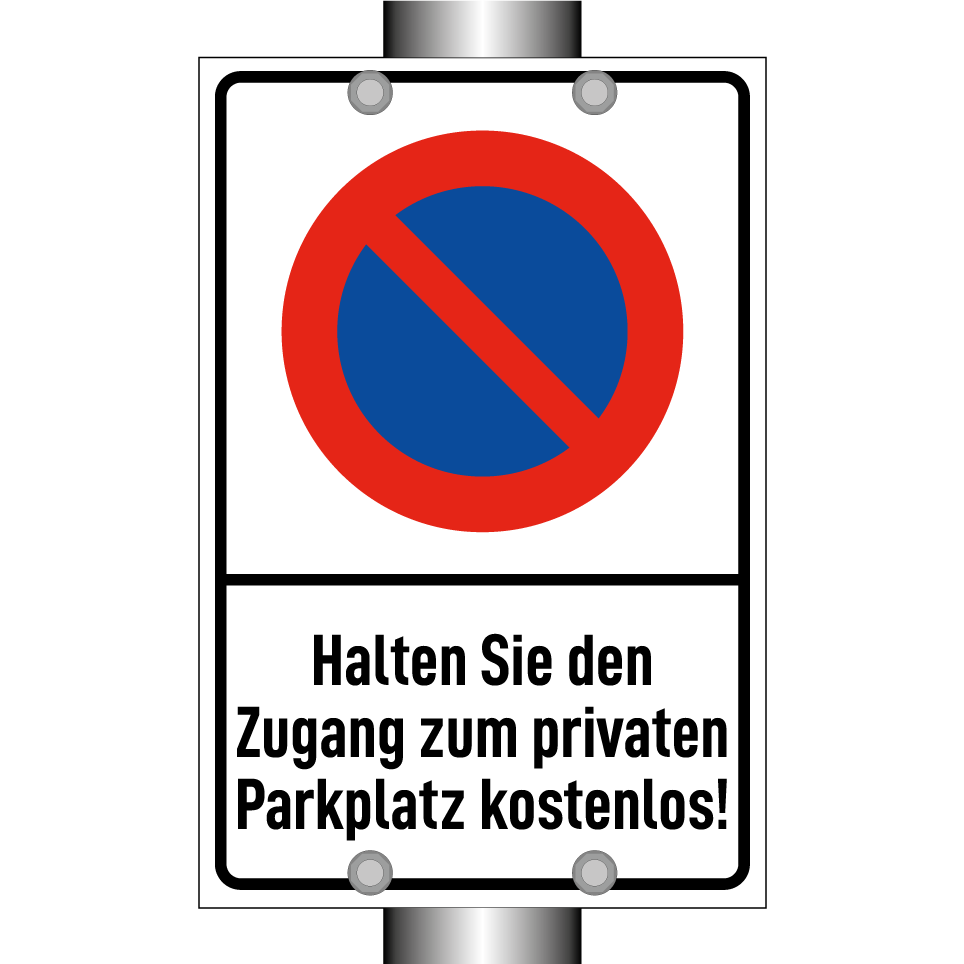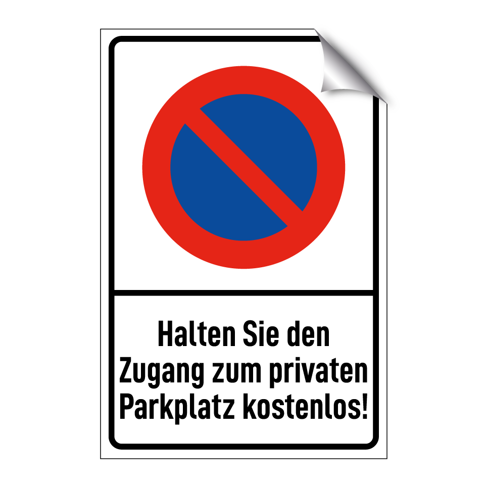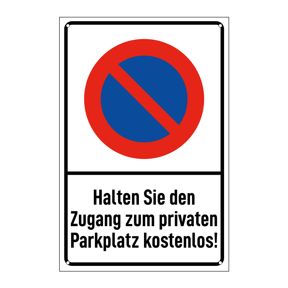 Parkverbotsschild mit dem Text Halten Sie den Zugang zum privaten Parkplatz kostenlos!