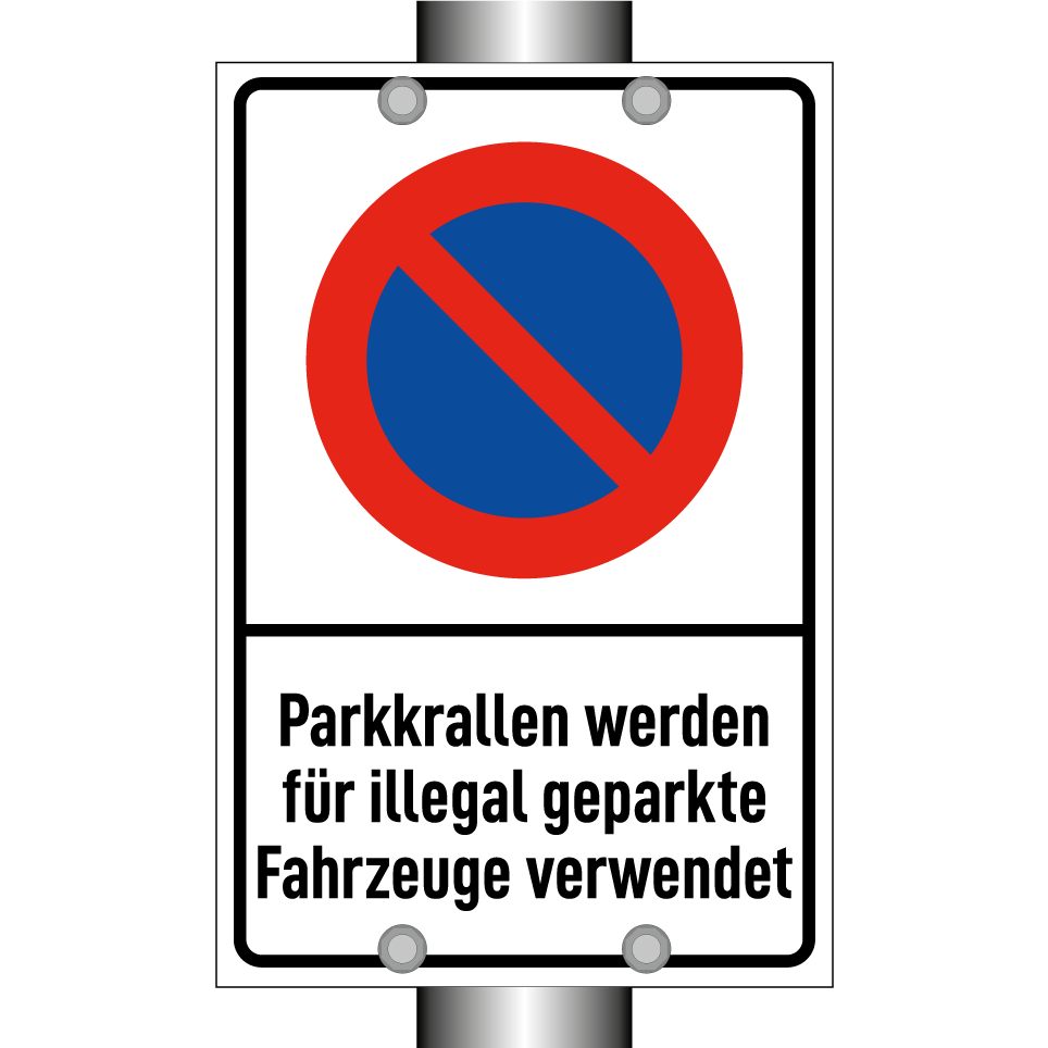 Parkverbotsschild mit dem Text Parkkrallen werden für illegal geparkte Fahrzeuge verwendet