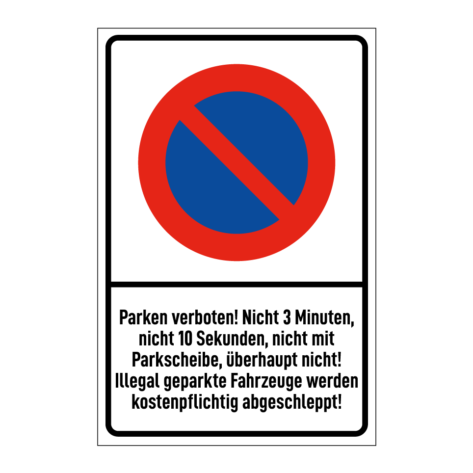 Parkverbotsschild mit dem Text Parken verboten! Nicht 3 Minuten, nicht 10 Sekunden, nicht mit Parkscheibe, überhaupt nicht! Illegal geparkte Fahrzeuge werden kostenpflichtig abgeschleppt!