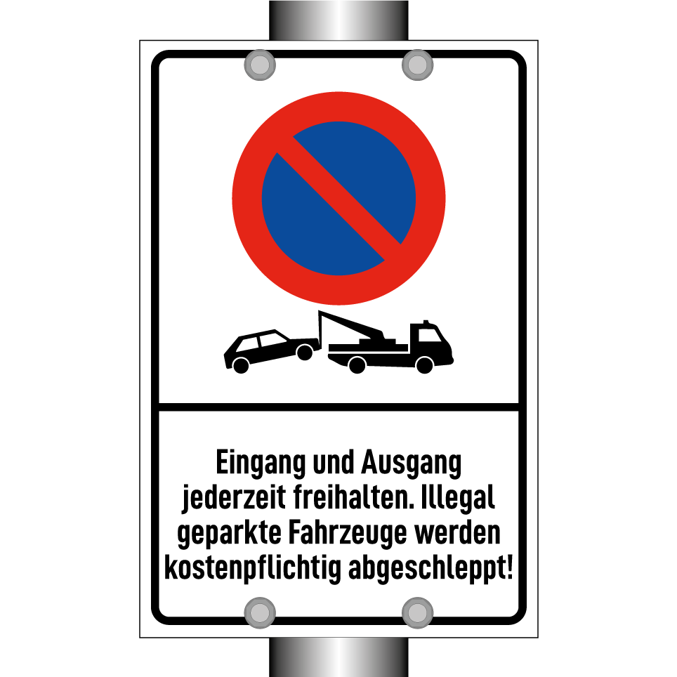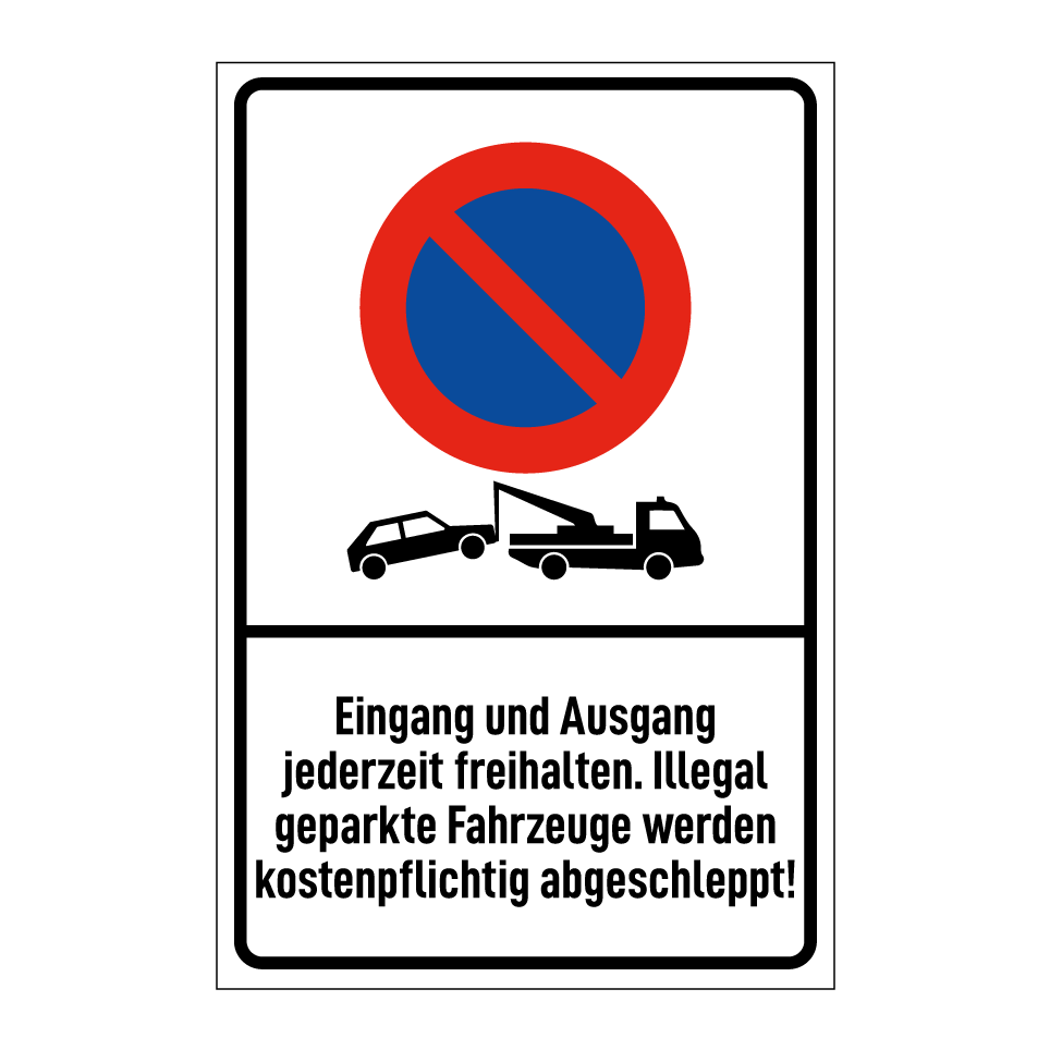 Parkverbotsschild mit dem Text Eingang und Ausgang jederzeit freihalten. Illegal geparkte Fahrzeuge werden kostenpflichtig abgeschleppt!