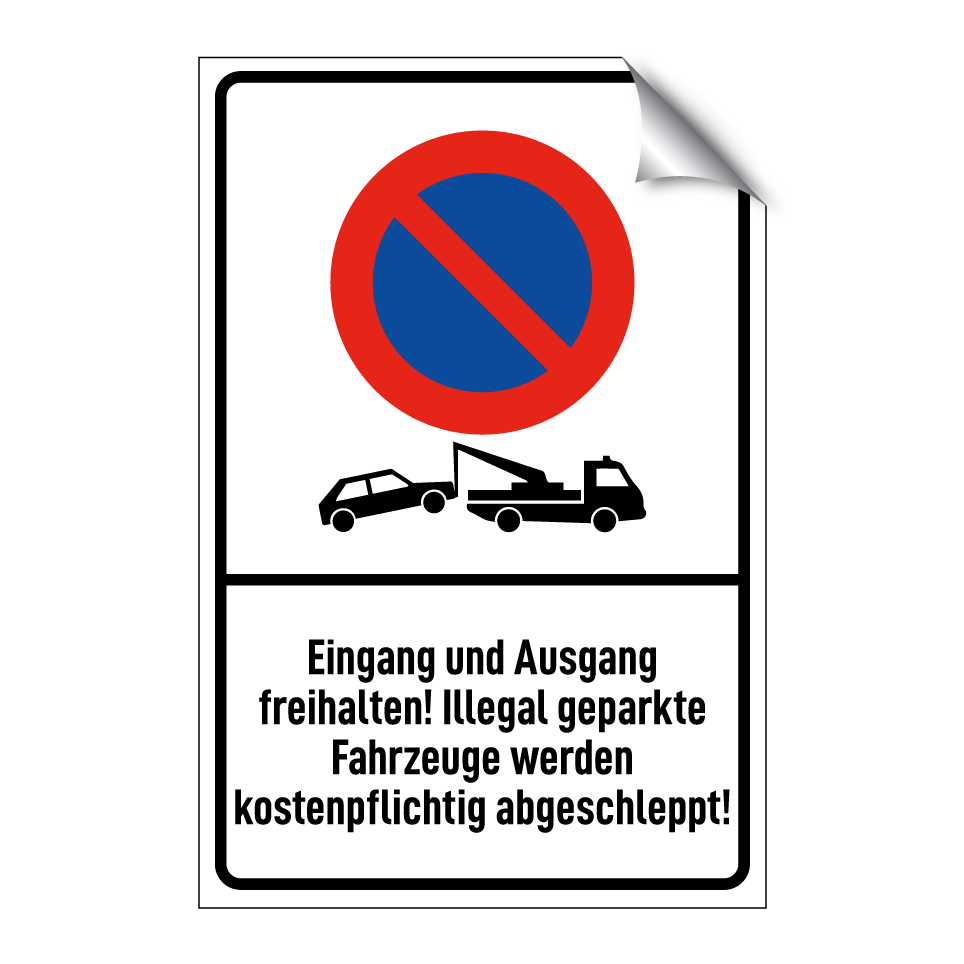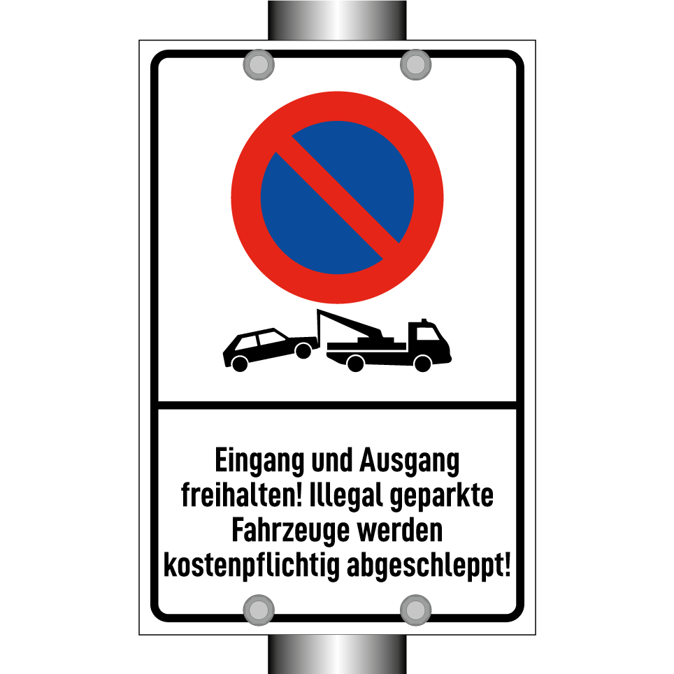 Parkverbotsschild mit dem Text Eingang und Ausgang freihalten! Illegal geparkte Fahrzeuge werden kostenpflichtig abgeschleppt!