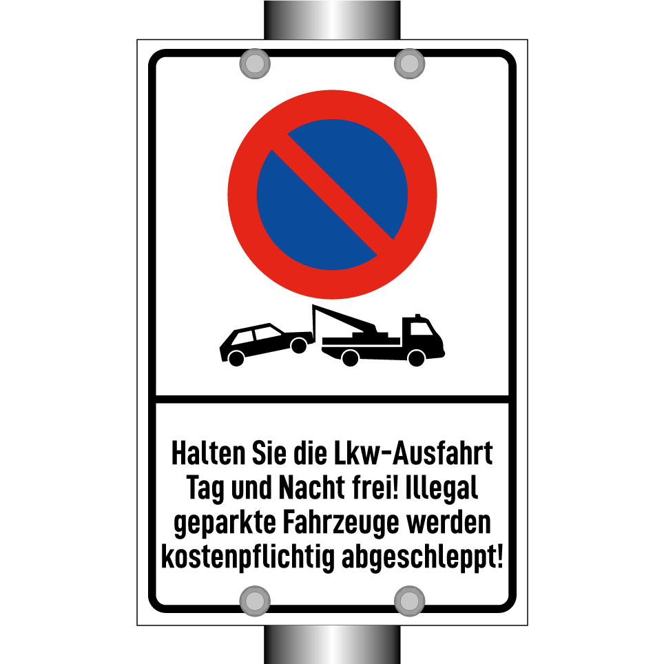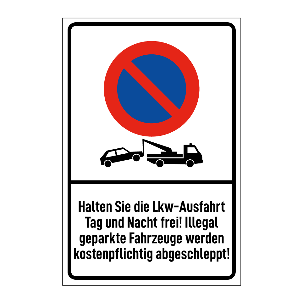 Parkverbotsschild mit dem Text Halten Sie die Lkw-Ausfahrt Tag und Nacht frei! Illegal geparkte Fahrzeuge werden kostenpflichtig abgeschleppt!