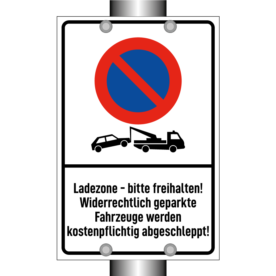 Parkverbotsschild mit dem Text Ladezone - bitte freihalten! Widerrechtlich geparkte Fahrzeuge werden kostenpflichtig abgeschleppt!