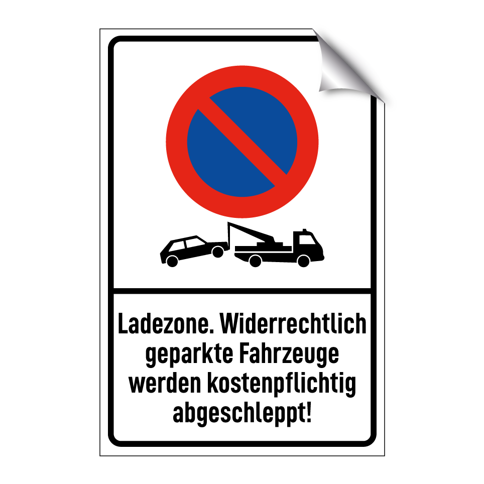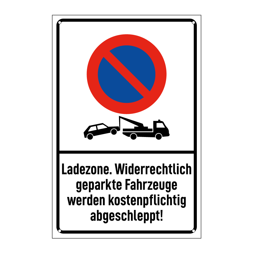Parkverbotsschild mit dem Text Ladezone. Widerrechtlich geparkte Fahrzeuge werden kostenpflichtig abgeschleppt!