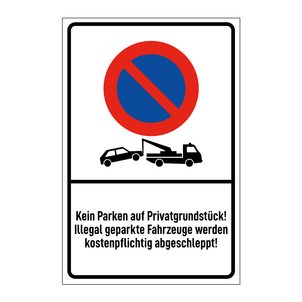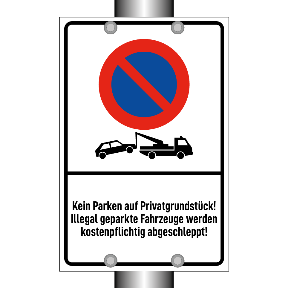 Parkverbotsschild mit dem Text Kein Parken auf Privatgrundstück! Illegal geparkte Fahrzeuge werden kostenpflichtig abgeschleppt!
